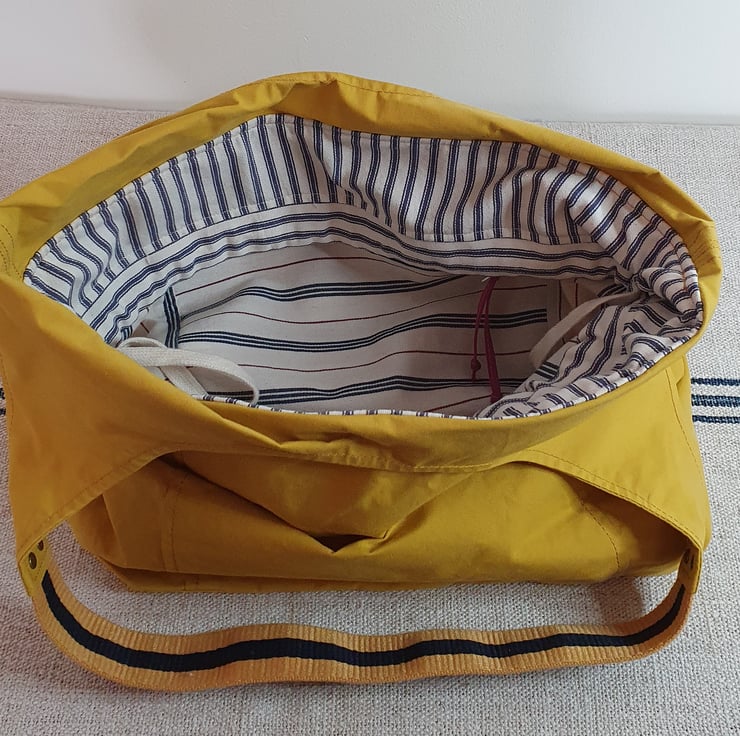 A stripped webbing for the handles, which are riveted to the bag for strength.