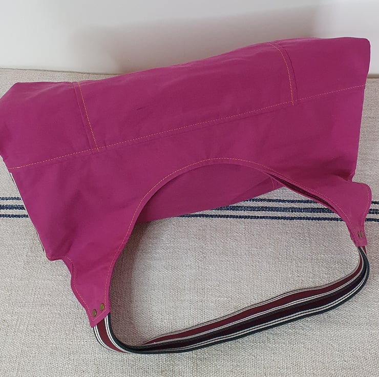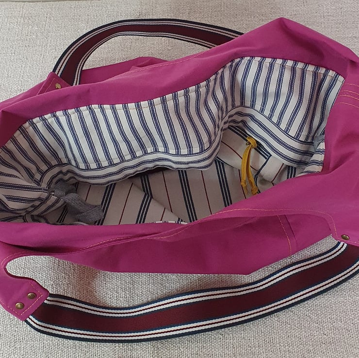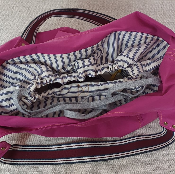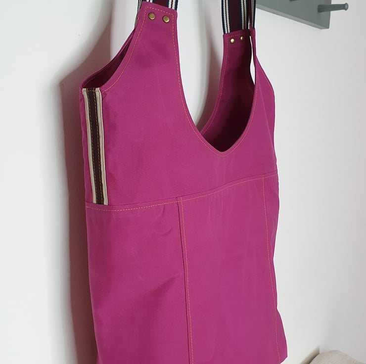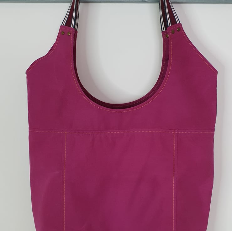 A stripped webbing for the handles, which are riveted to the bag for strength.
