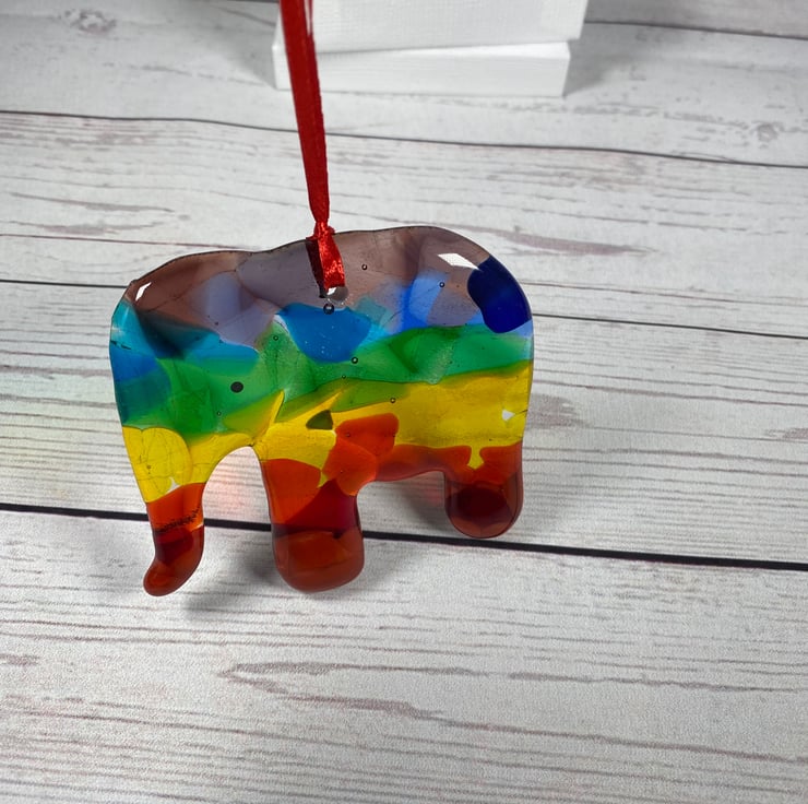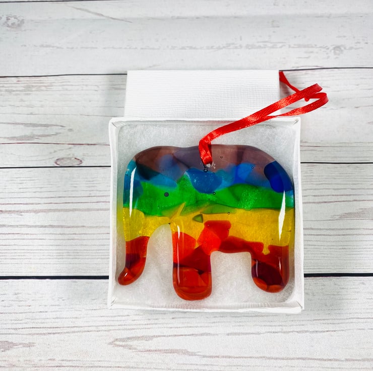 Gorgeous and unique fused glass cast elephant which is lovingly made by me in my home studio. All the colours of the rainbow make this a cheery elephant . Made as a celebration of gay pride and a celebration of colour,diversity and hope . Drilled and strung with satin ribbon and presented in a white gift box. Aprox 4 in diameter