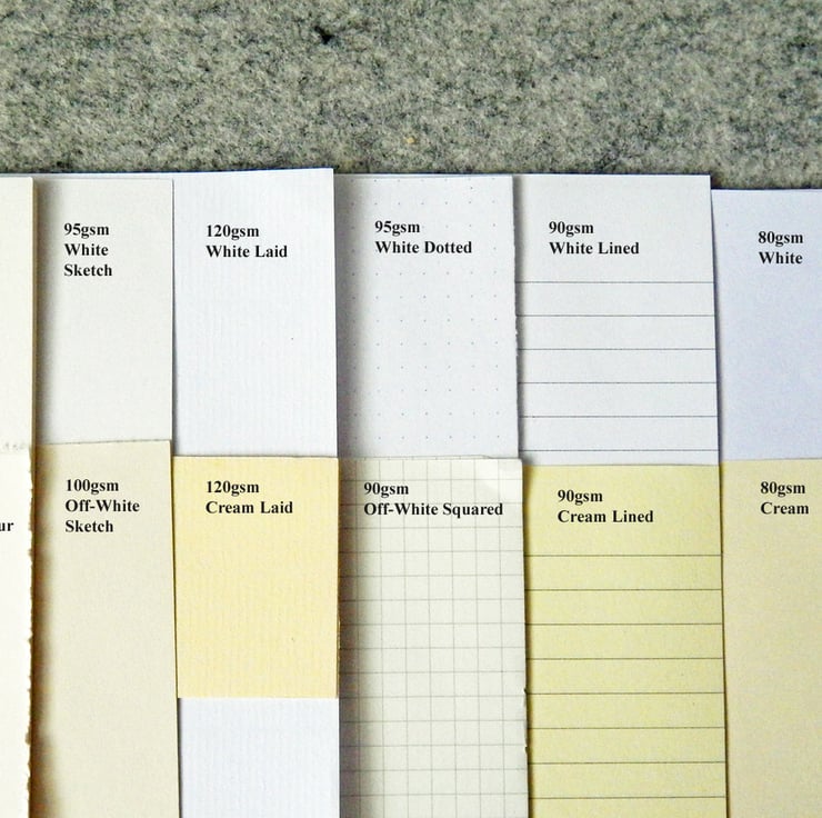 There is a wide range of paper options available for the inside, including 30 pages of lined or plain text paper, in white or cream, white with a dotted or squared grid, white sketch or watercolour paper (20 pages), or a rainbow of 32 bright or pastel pages (which are the most popular of all!)