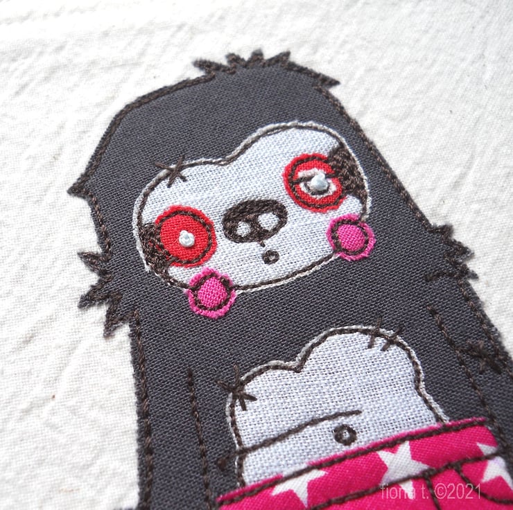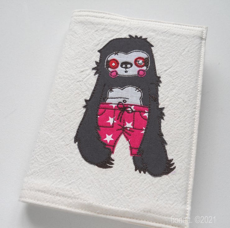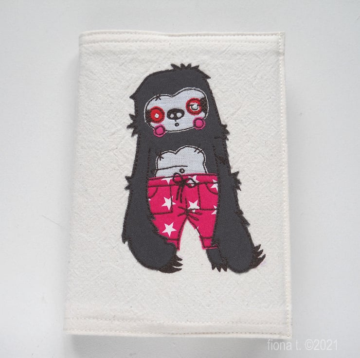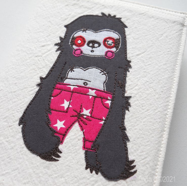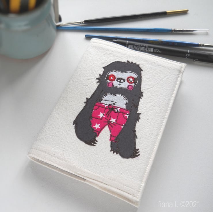 applique & freehand embroidered pyjama'd zombie sloth notebook cover with A6 sketchbook inside.