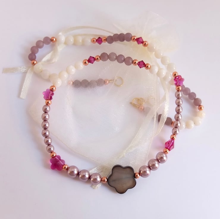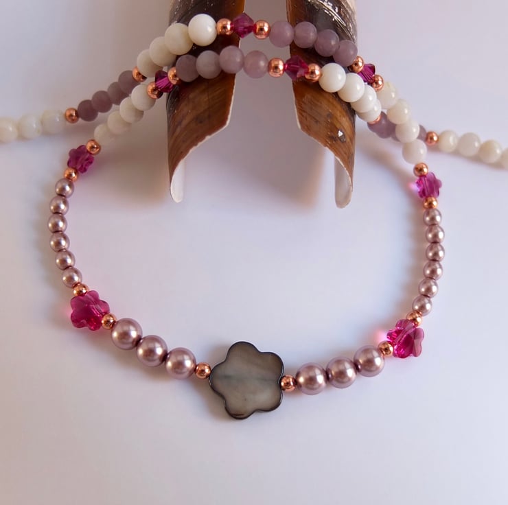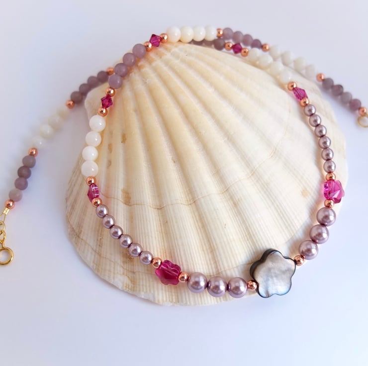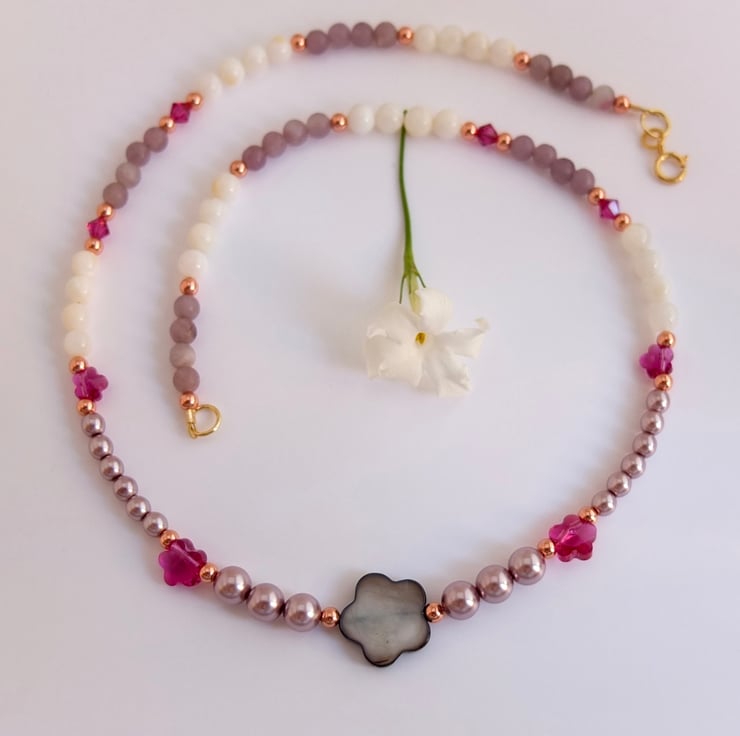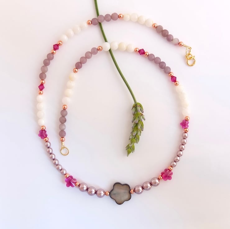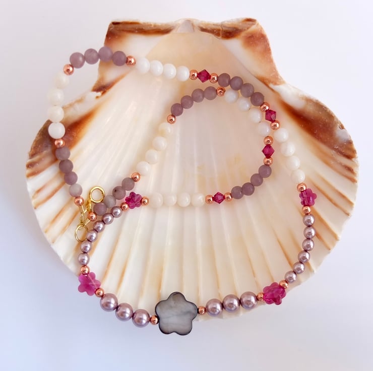 A 15mm graphite mother-of-pearl flower shaped bead takes centre place between dusky mauve Czech glass pearls, white shell that glistens with mother-of-pearl and lavender lepidolite beads.