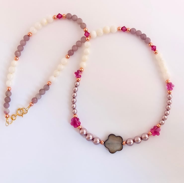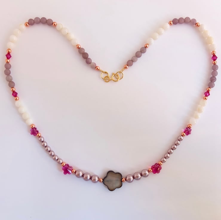 Summery, feminine, eye-catching necklace in shades of pink, white and purple.