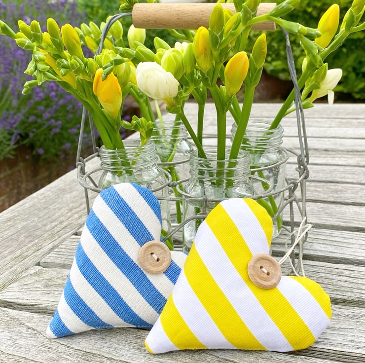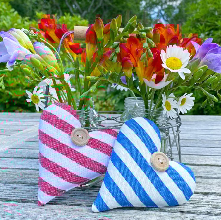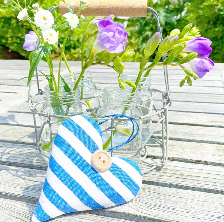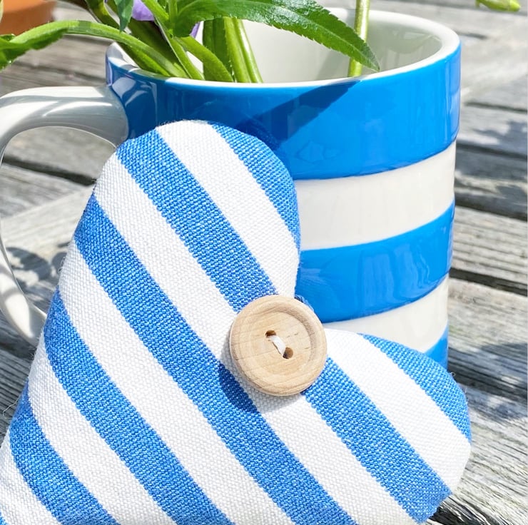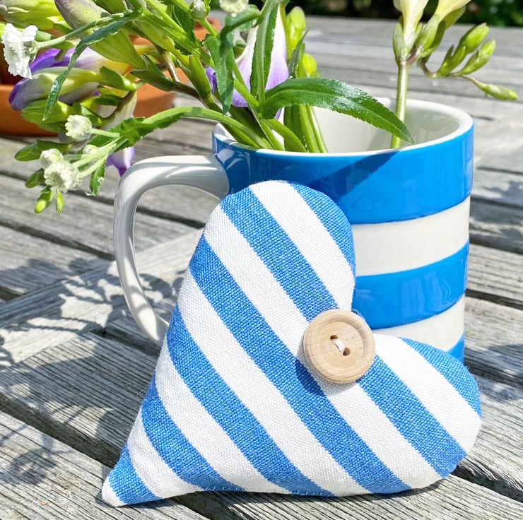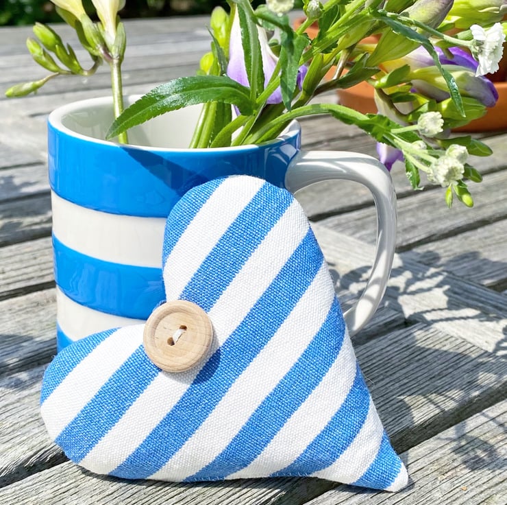 A bigger, bolder stripey heart in beautiful blue and white stripes (1cm width stripes on front and narrower ticking stripes on back), hand finished with a rustic wooden button, a linen 'h&h' label and a blue hemp twine hanging loop. Filled with super fragrant Hampshire lavender or padded with toy-grade stuffing.