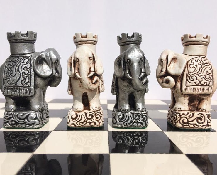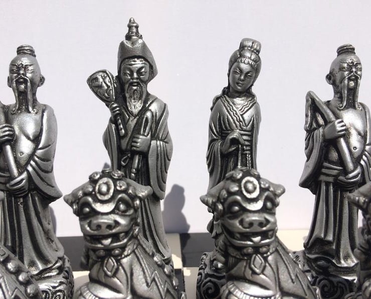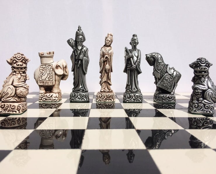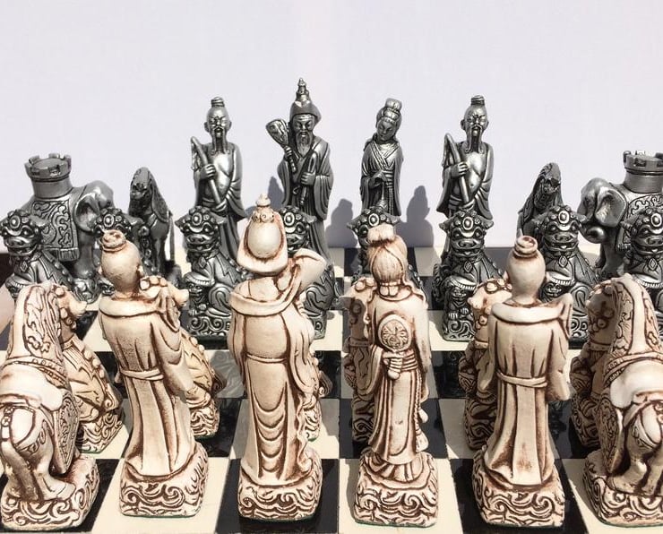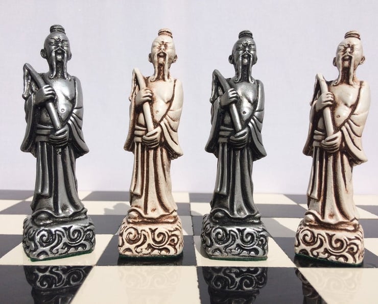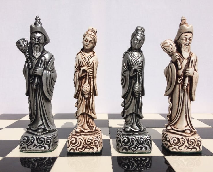 This listing is for a beautiful collection of antique effect Oriental themed Chess pieces in soft Aged Silver & Antique White aged effect (Chess pieces only). This chess set has all the presence of an old chess set with its antique chess paintwork. This is a wonderful example that sets Oriental themed old style chess sets into a league of their own.