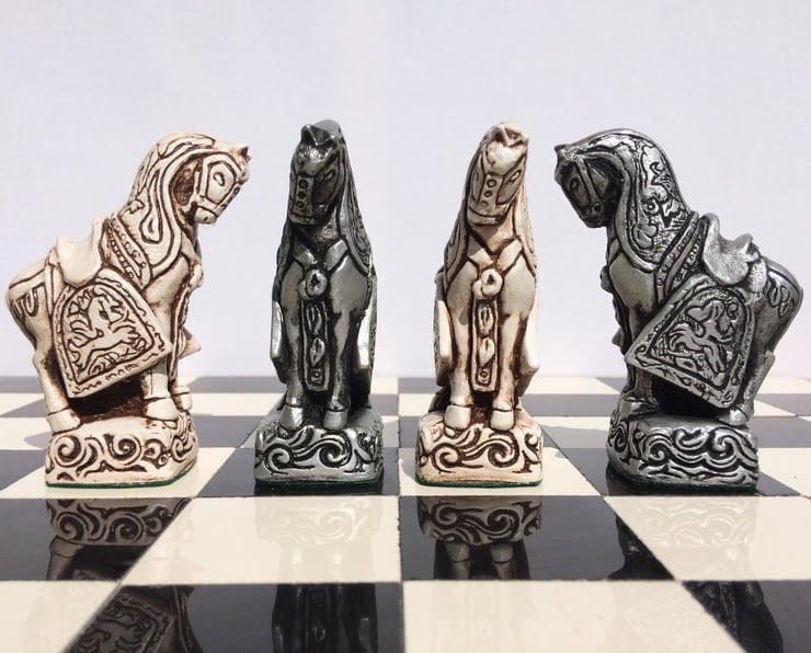 The chess pieces are cold cast using reconstructed stone with an acrylic polymer.