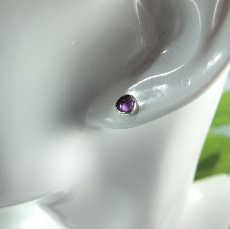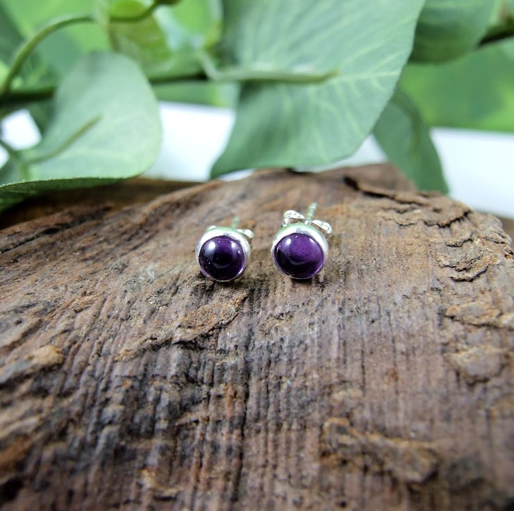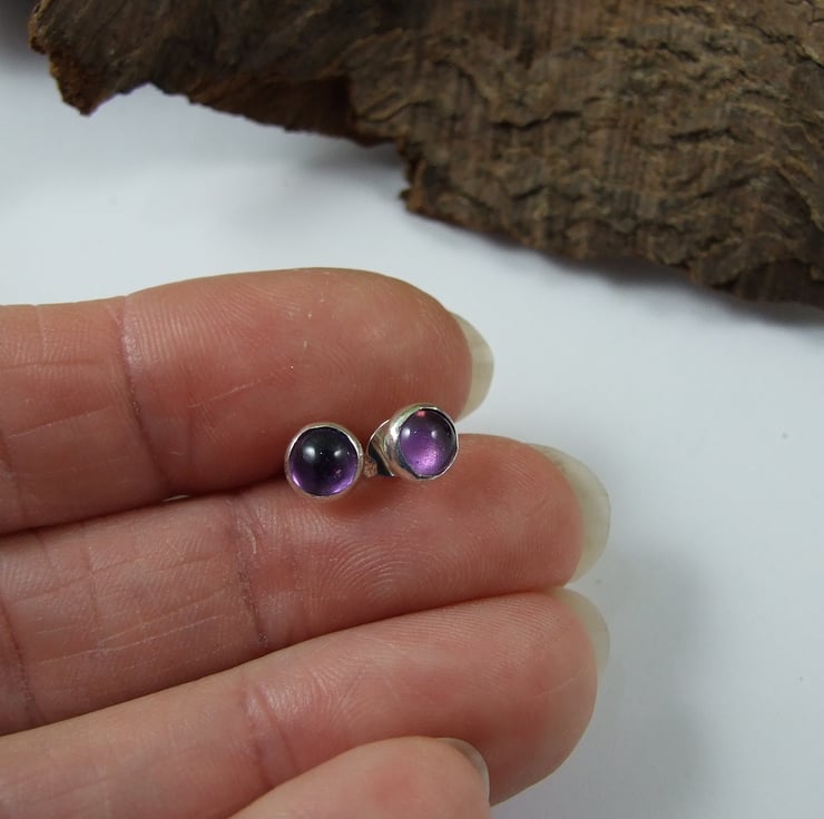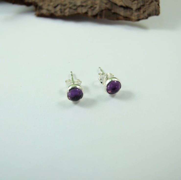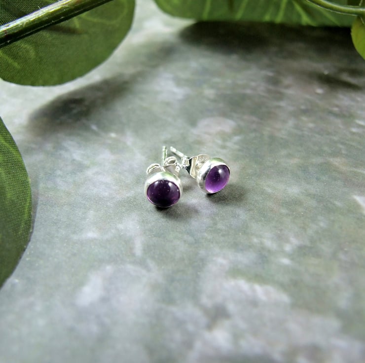 The dainty 5mm studs have been created from 5mm amethyst cabachons set in sterling silver bezel. Studs have butterfly backs.
