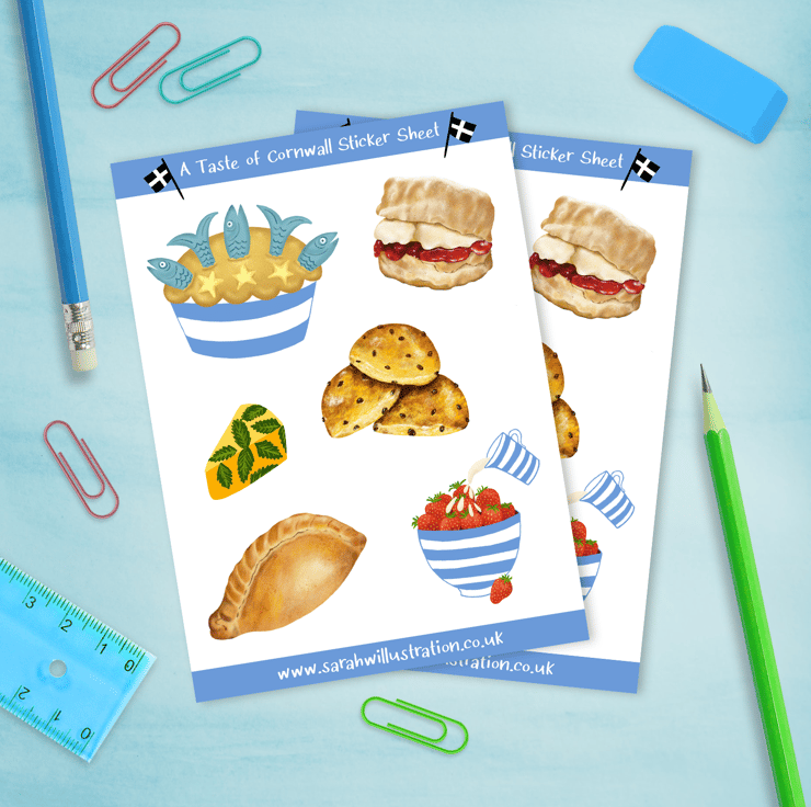 Love Cornwal? Then you will love these 6 illustrated stickers of iconic Cornish foods including Stargazy Pie, Scone done the traditional Cornish way of jam first, Cornish saffron buns, Cornish pasty, Cornish Yarg cheese and a Cornishware bowl with strawberries and cream.