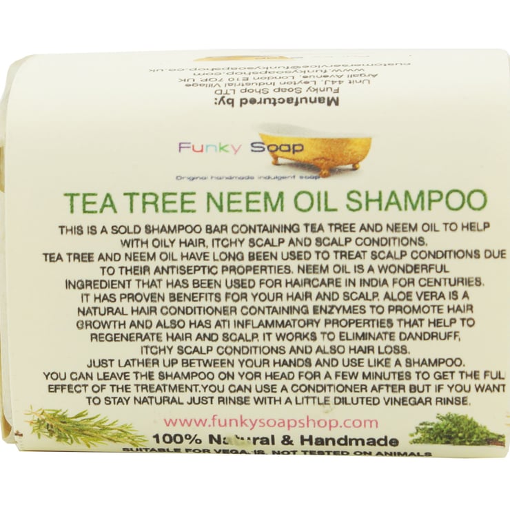 THIS IS A SOLD SHAMPOO BAR CONTAINING TEA TREE AND NEEM OIL TO HELP WITH OILY HAIR ITCHY SCALP AND SCALP CONDITIONS.