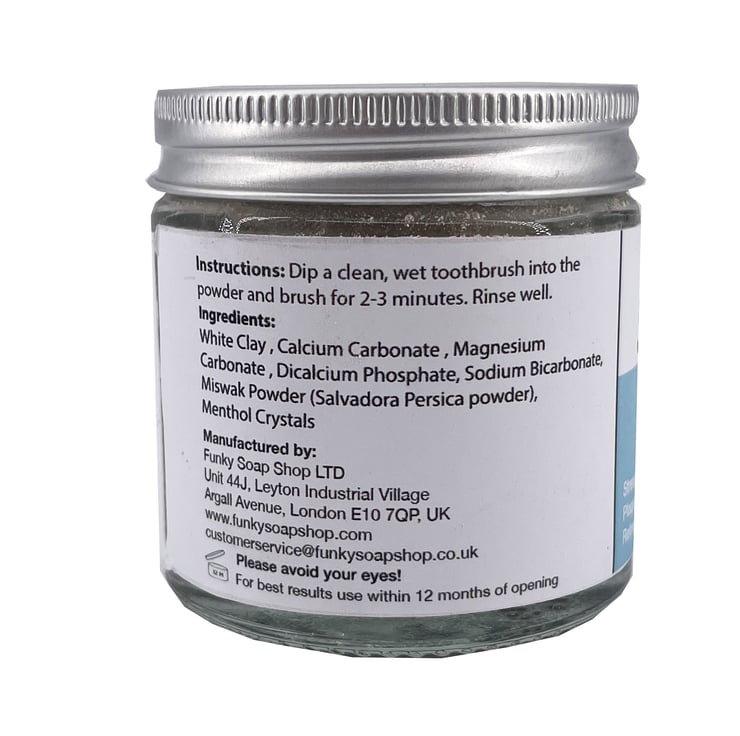 Ingredients: White Clay , Calcium Carbonate , Magnesium Carbonate , Dicalcium Phosphate, Sodium Bicarbonate, Miswak Powder (Salvadora Persica powder), Menthol Crystals