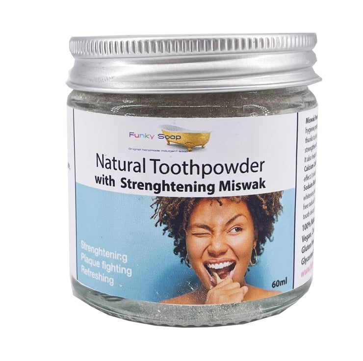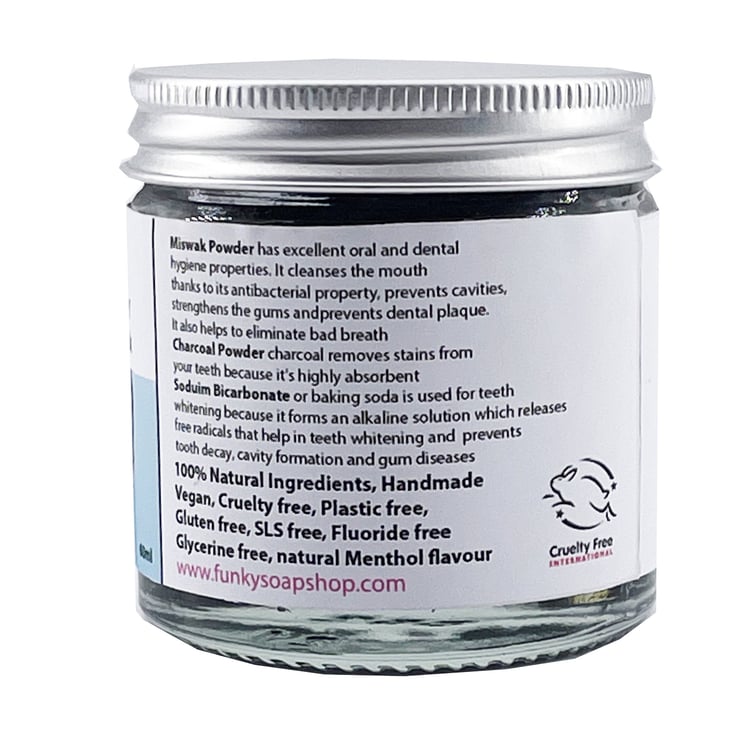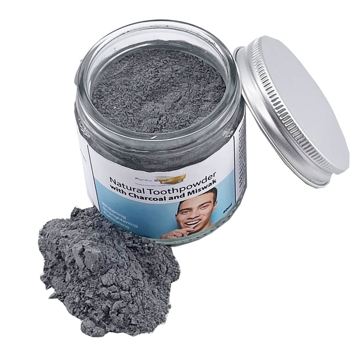 Our 100% Natural Tooth powder works by absorbing and polishing away naturally occurring stains and plaque without the use of any synthetic chemicals such as SLS, peroxides and fluorides. It contains a high percentage of Miswak which is a proven to kill gum disease and fight plaque and has been used for centuries for oral care.
