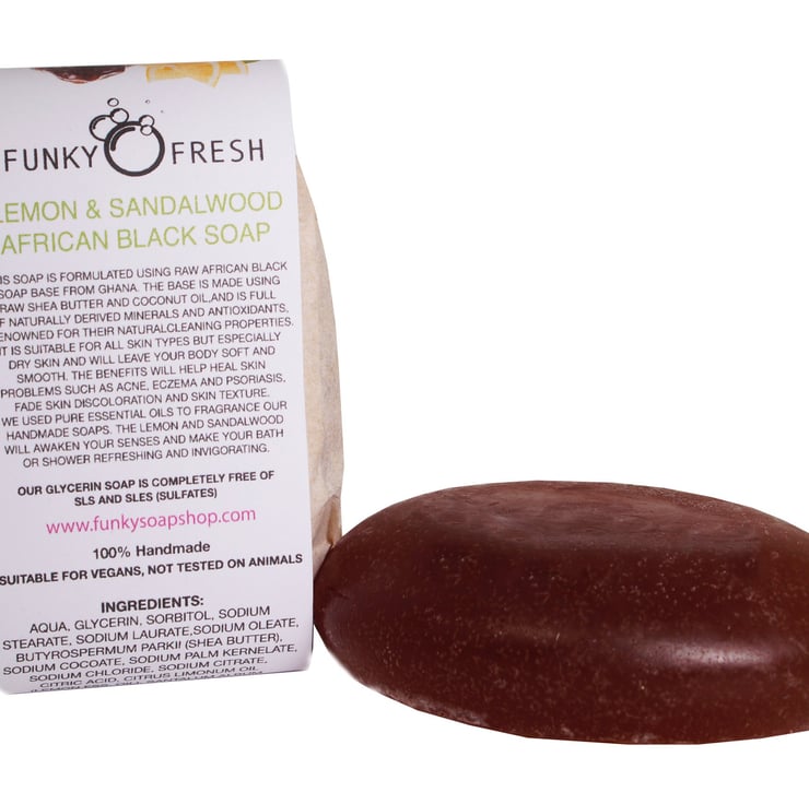 This soap is formulated using raw African black soap base from Ghana The base is made using raw shea butter and coconut oil, and is full of naturally derived minerals and antioxidants, renowned for their natural cleaning properties. It is suitable for all skin types but especially dry skin and will leave your body soft and smooth. This soap will help heal skin problems such as acne, eczema and psoriasis, fade skin discolouration and skin texture. We used pure essential oils to fragrance our handmade soaps. The lemon and sandalwood will awaken your senses and make your bath or shower refreshing and invigorating.