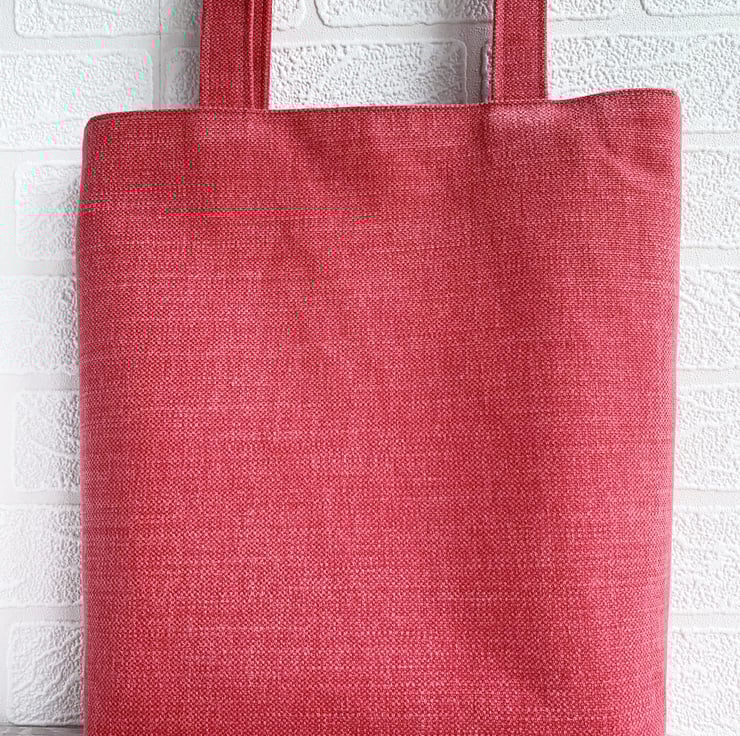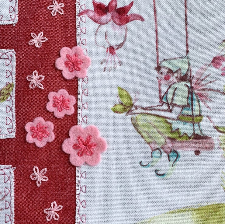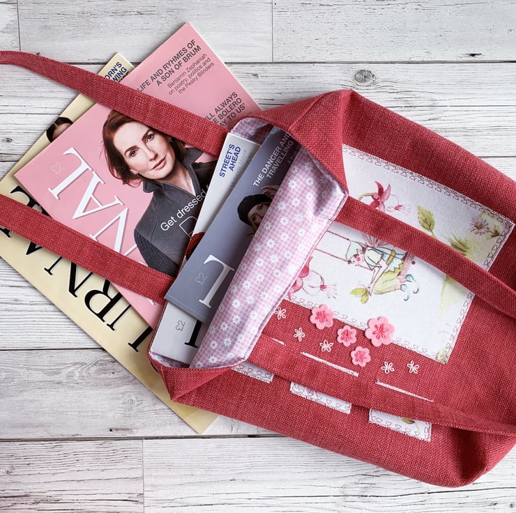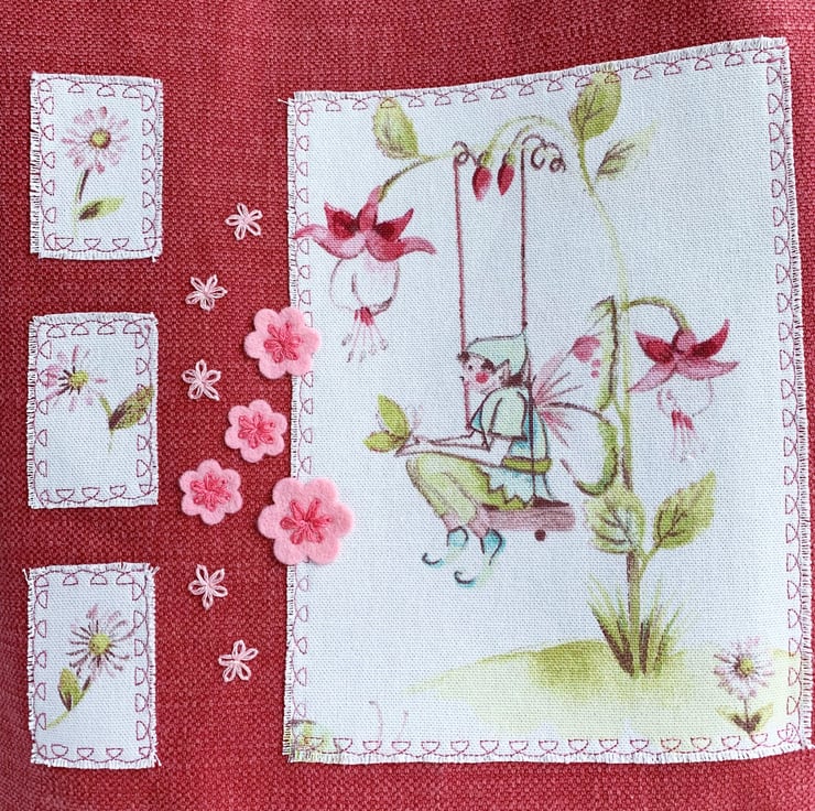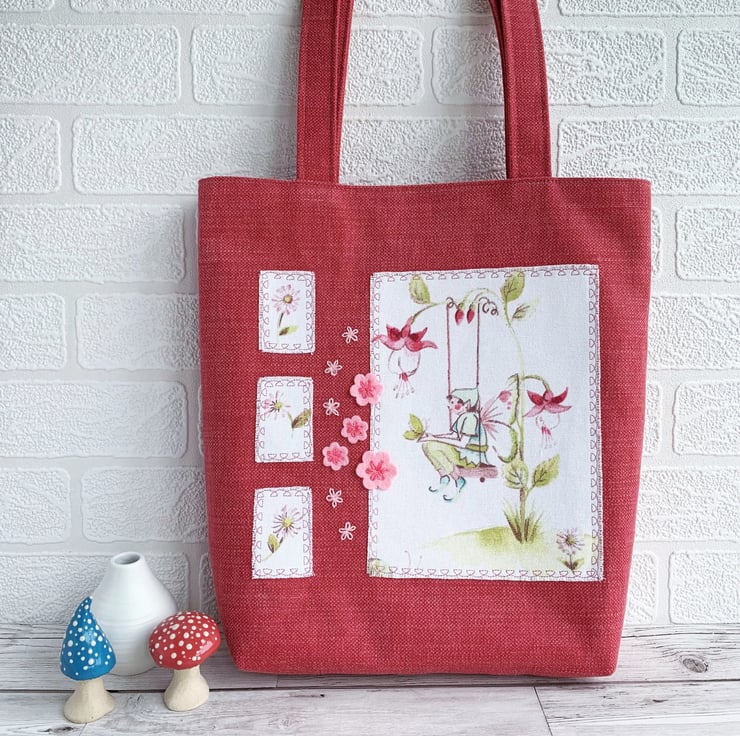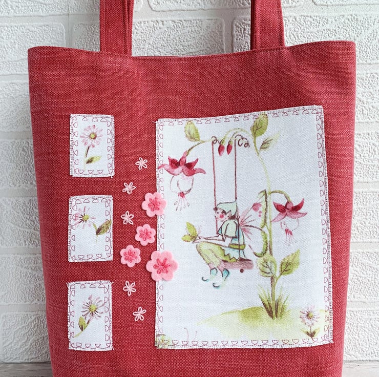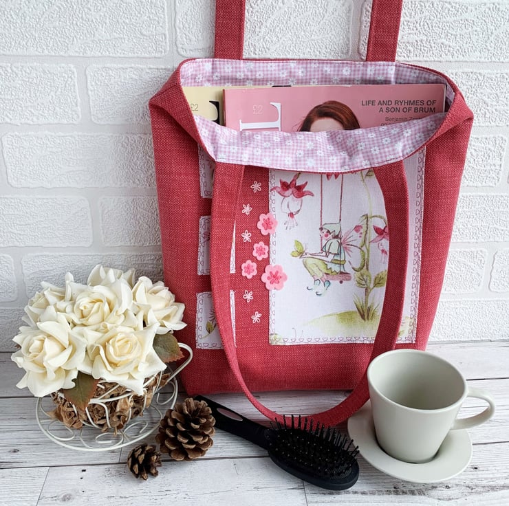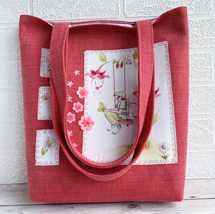 Floral fairy tote bag with fuchsias. This lovely tote bag in sturdy coral pink fabric has appliqué panels cut from delightful floral fairies print fabric in pastel shades of mainly pink and green on a white background. The largest panel features a male fairy sitting on a swing surrounded by fuchsia flowers and zesty green leaves. A green butterfly is resting on his hands. Three smaller panels each feature a daisy. I’ve edged the panels with machine-embroidered dark pink looped decorative stitching and then frayed the edges of the fabric. Between the panels I've hand-embroidered a scattering of pale pink lazy daisies and added some pale pink felt flowers which I’ve secured in place with further lazy daisies in darker pink thread. The bag is lined with pretty pale pink and white gingham with an overlaid pattern of ditsy white flowers.