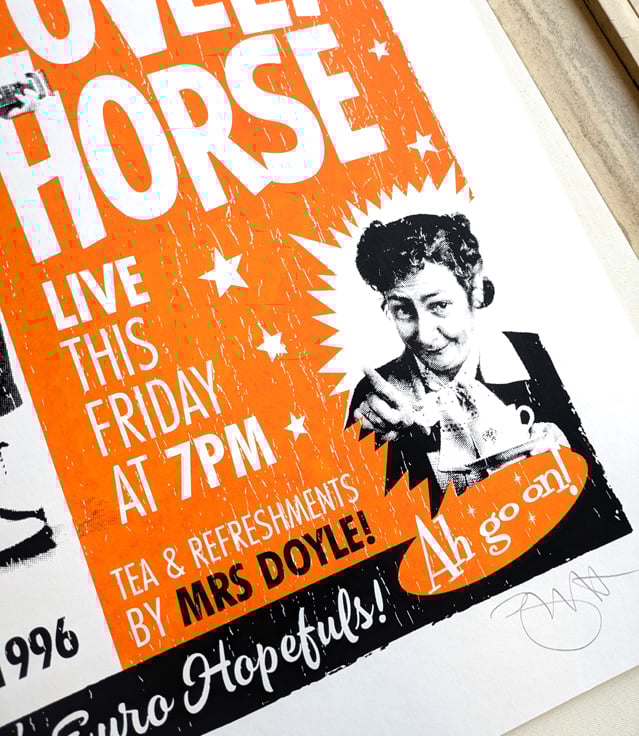 This two colour hand pulled screen print measures 50cm x 70cm, 19.68” x 27.55” (approx) and is printed on 250gsm art stock. Each print is signed & numbered and is strictly limited to an edition of only 300 so once they’re gone they’re gone.