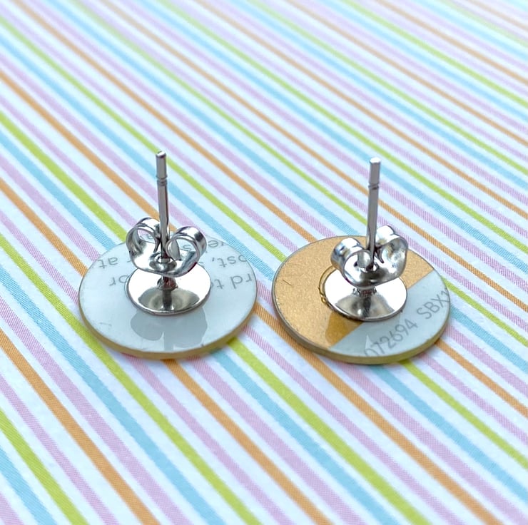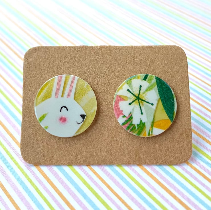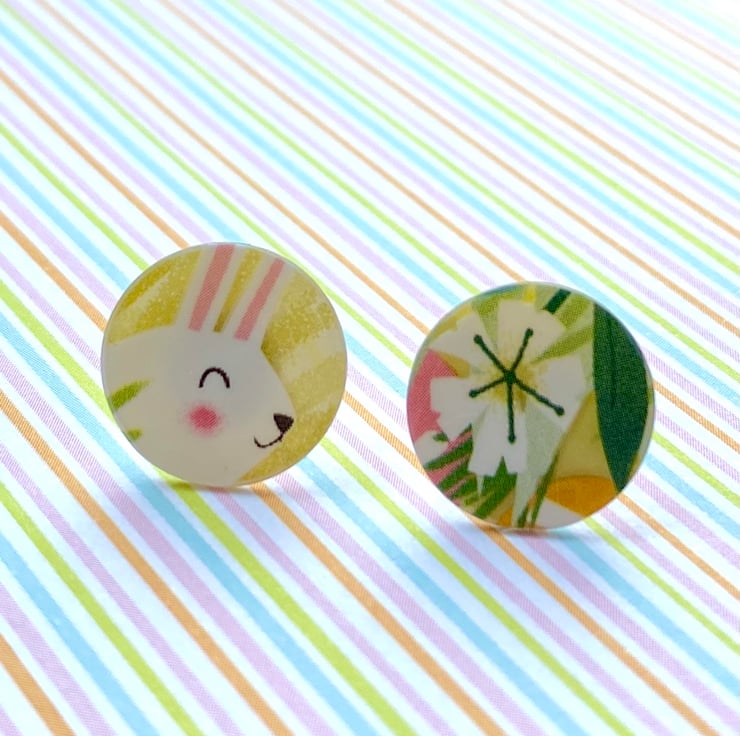 Made from a plastic store gift card, these 13mm studs feature a cute little white bunny on one earring and a sweet little white daisy with leaves on the other. In soft shades of green, pink and yellow, they’re perfect for summer!.