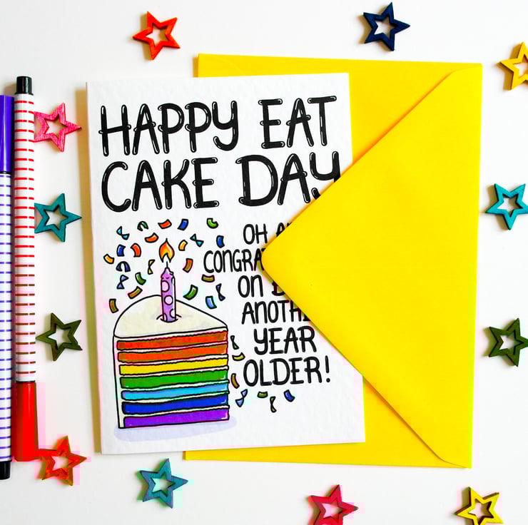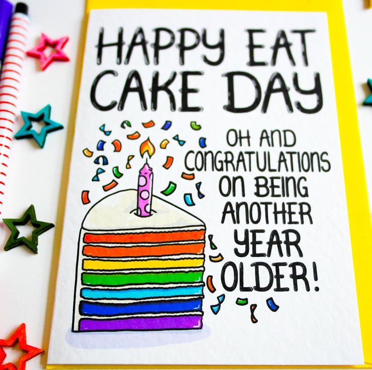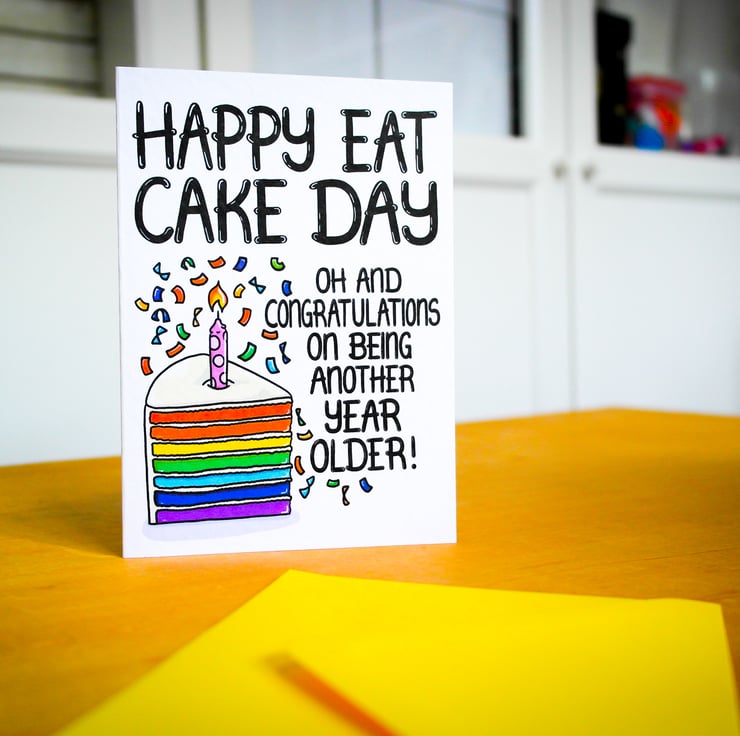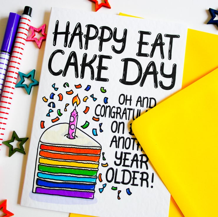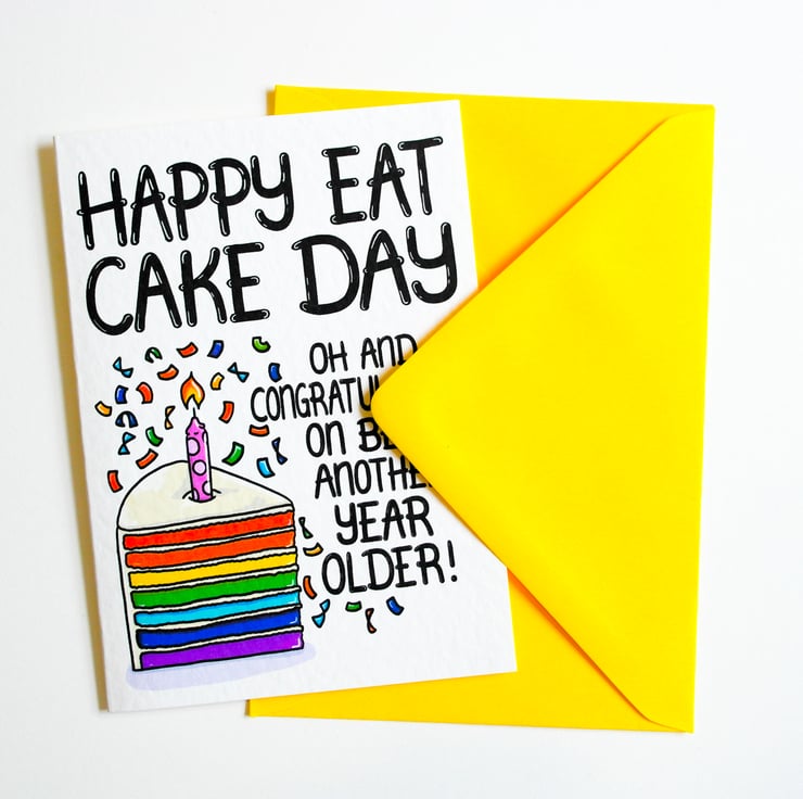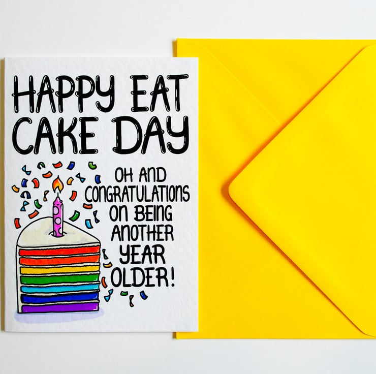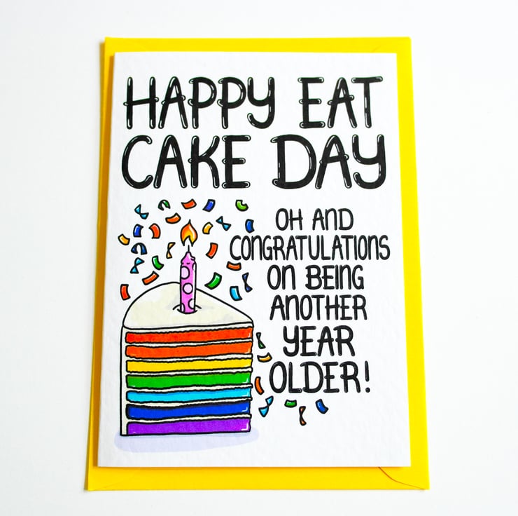 Greeting on front: HAPPY EAT CAKE DAY OH AND CONGRATULATIONS ON BEING ANOTHER YEAR OLDER!