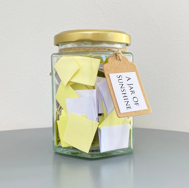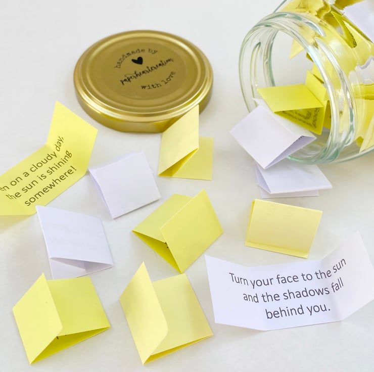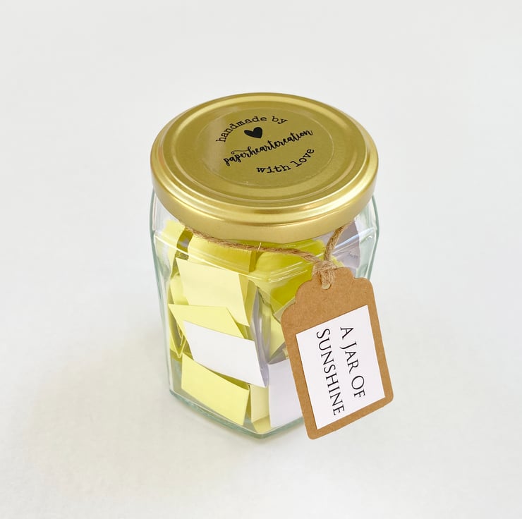Each jar contains 50 - 55 handmade quotes, printed on a mix of white and yellow card. The glass jar measures approx 9.8cm x 7.7cm.