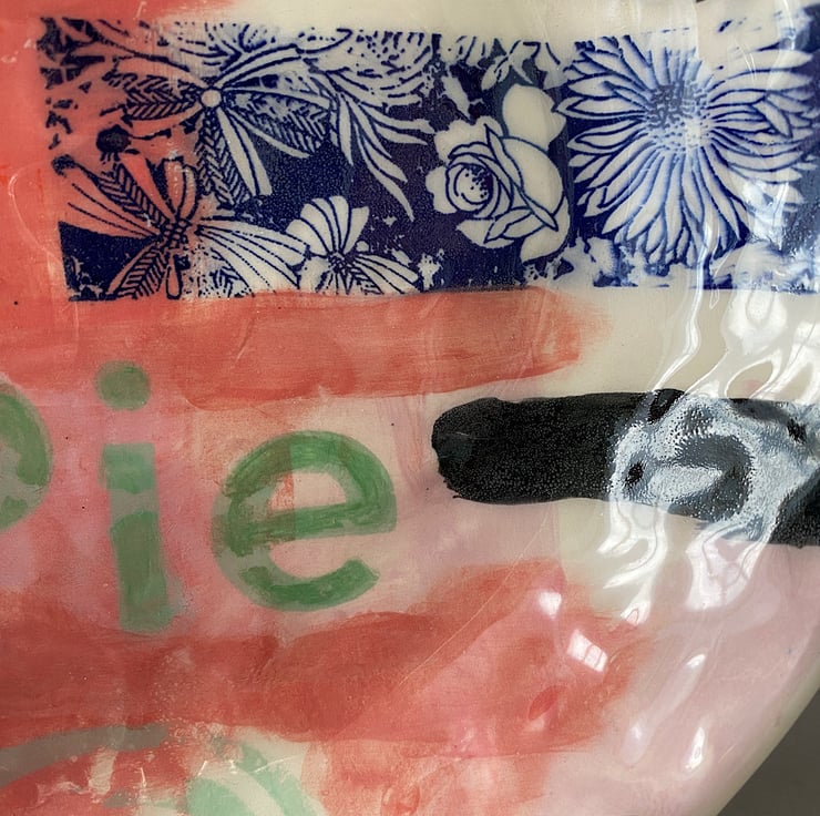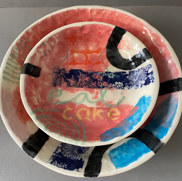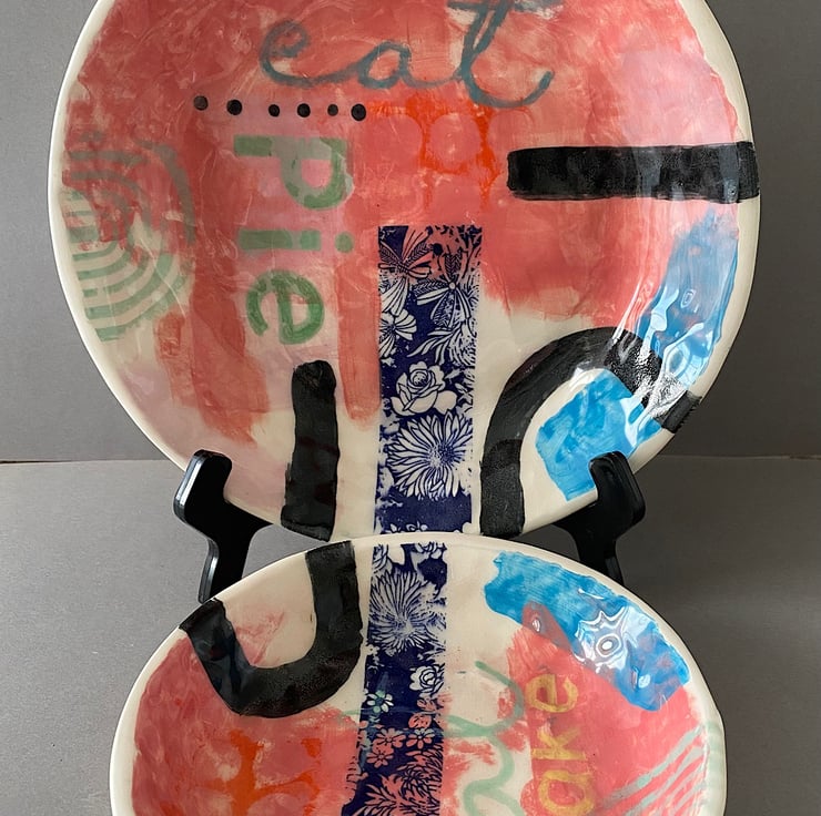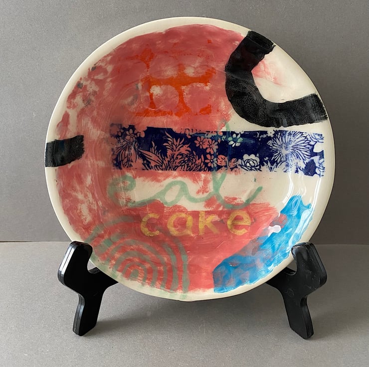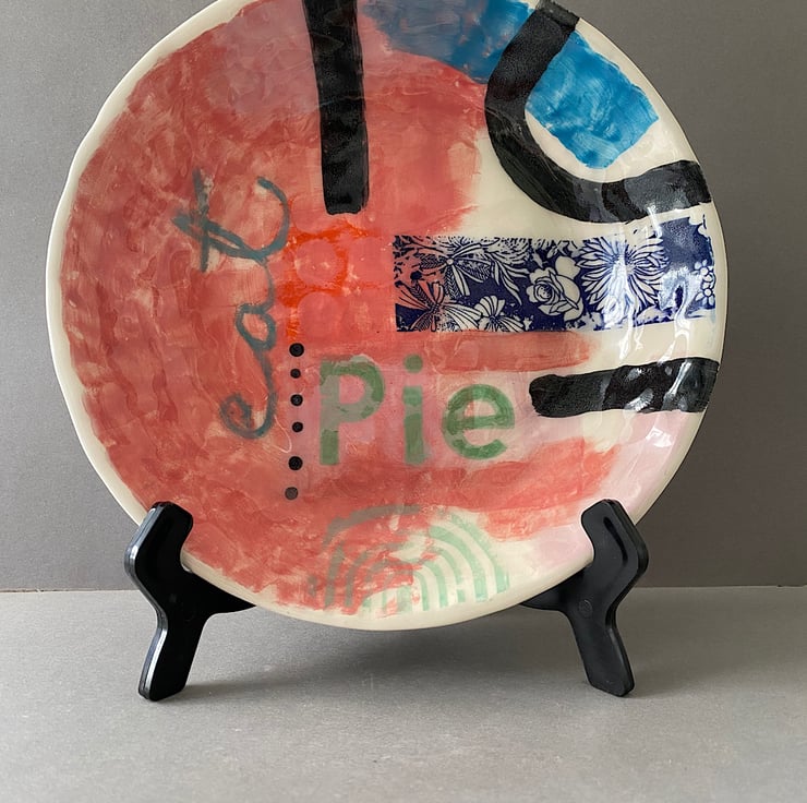 Handmade set of decorative plates. Made with creamy earthenware clay, decorated with a variety of techniques. Areas are hand painted and screen printed. A large sweep of pink sits under a variety of colours and patterns. “Eat Pie and Cake” feature (on the plates and in my life!) Wonderful fun to make and decorate and sometimes you just need to do what it says on the plate!