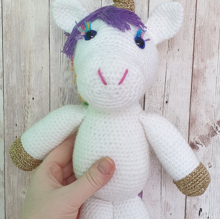 Twinkletoes is crocheted in a lovely soft white acrylic yarn for her main colour. Her hooves and horn are crafted from gold metallic yarn and really sparkle in sunlight.
