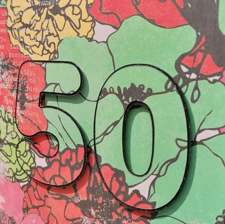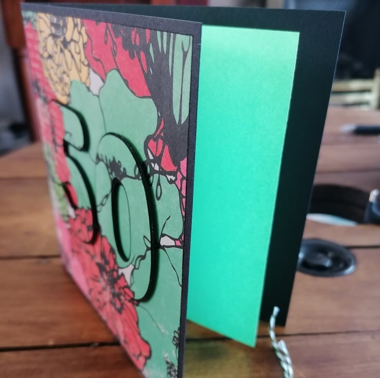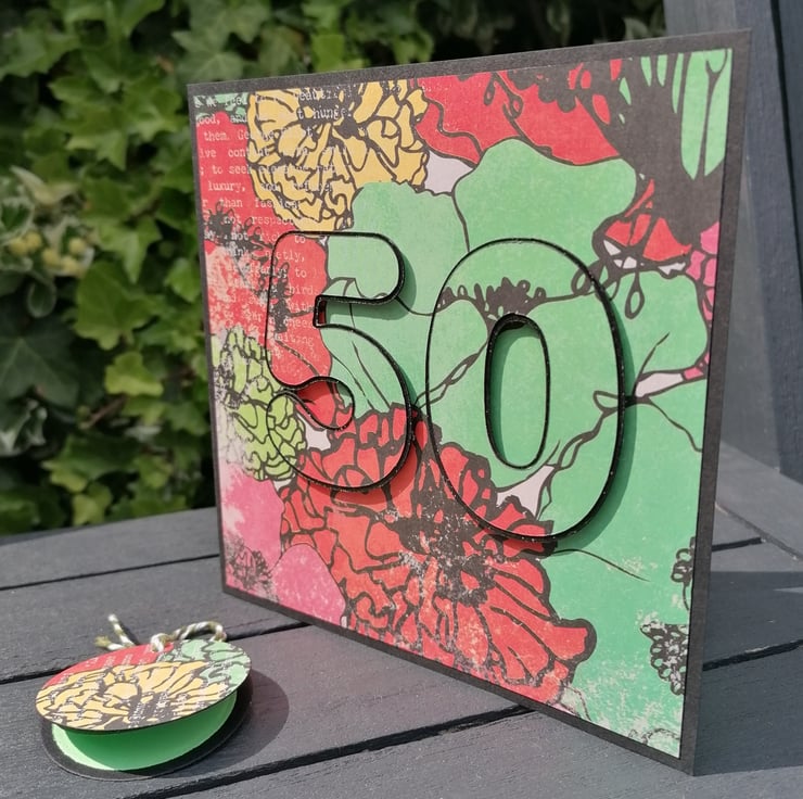 Green, yellow and red flower paper on a black card base. 50 is pattern matched to background, is raised and has a narrow black border. Matching gift tag included.
