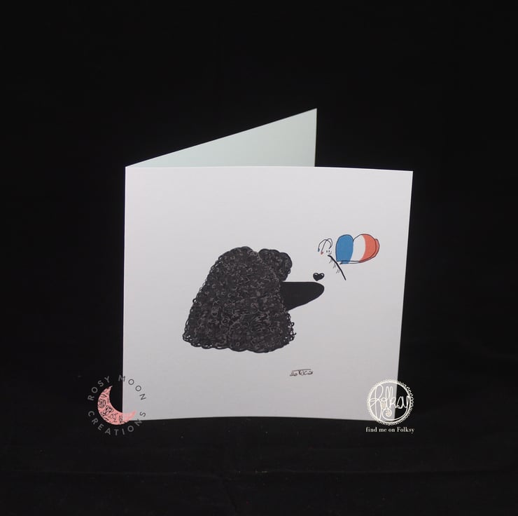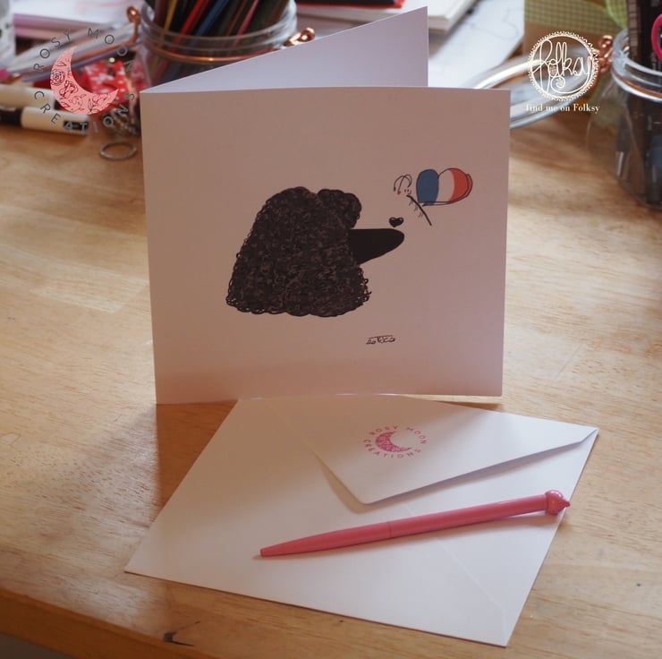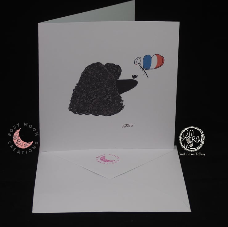 This hand drawn 17x17cm card featuring a French Poodle and it’s French Butterfly friend is blank on the inside for your very own special message.