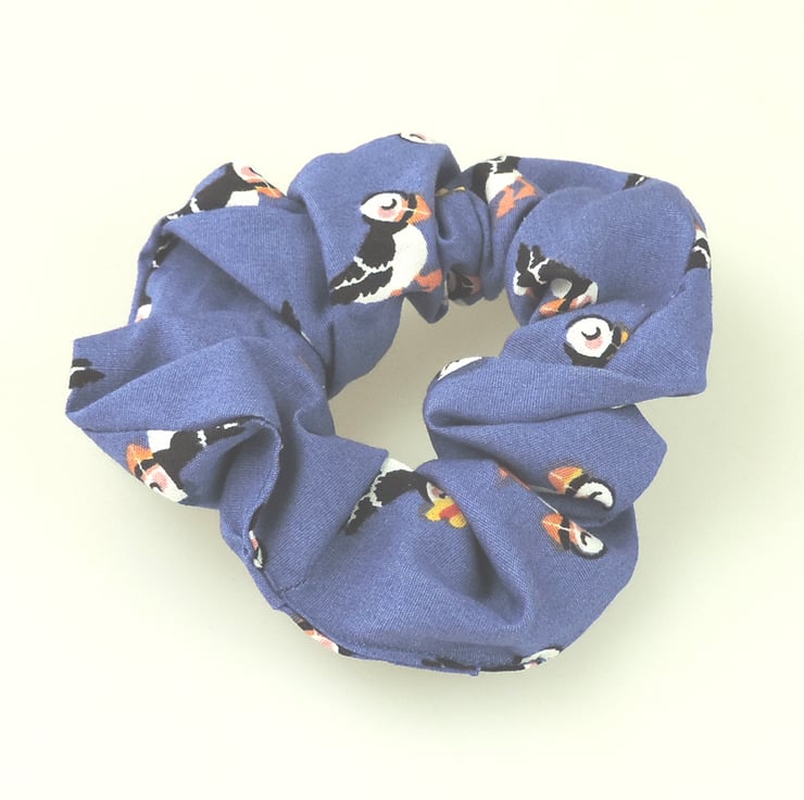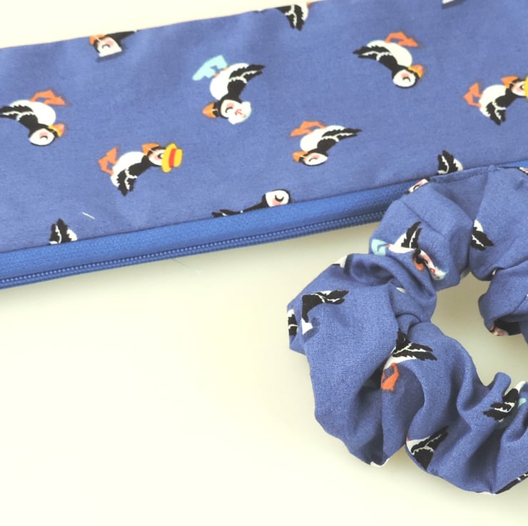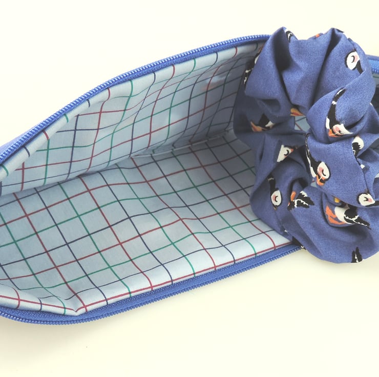 Colourful Puffins, some in hats and wellies, multi print pattern. Inside lined with a blue stripe, check.