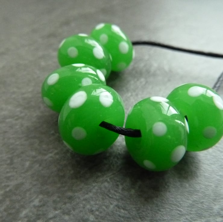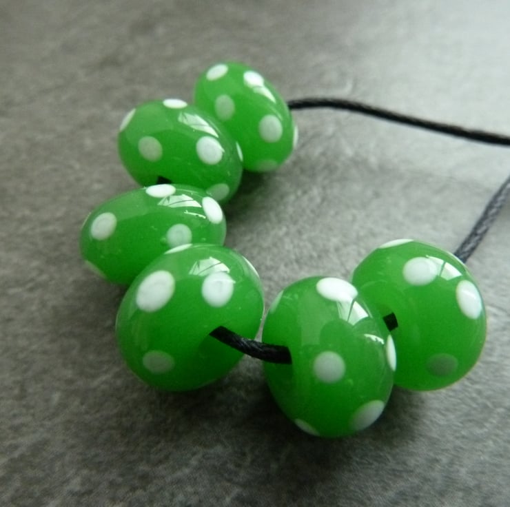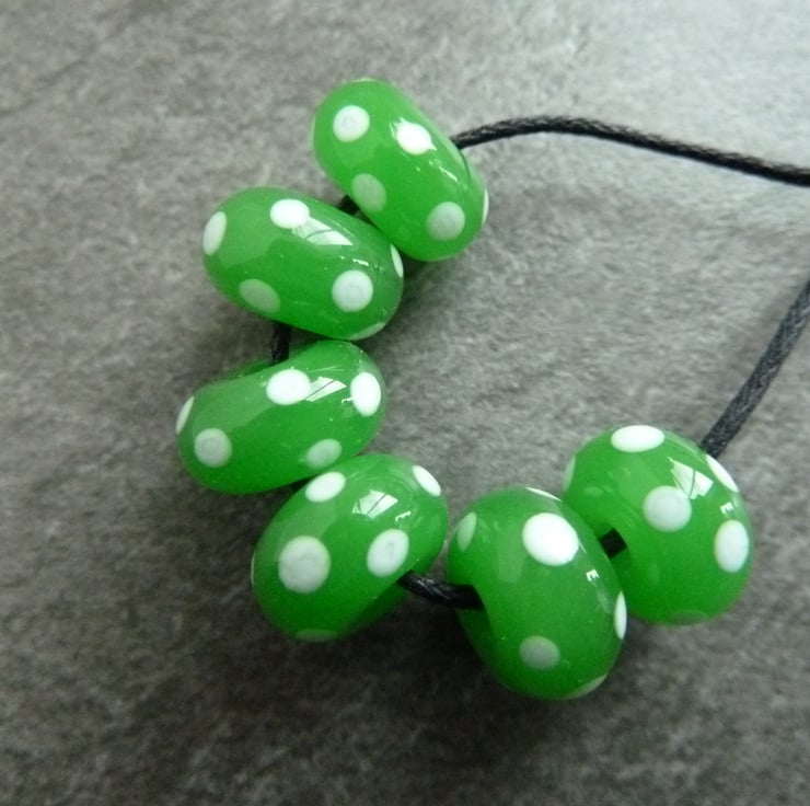 A set of 6 lampwork glass beads made with green glass and featuring white spots.