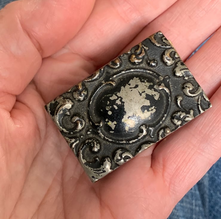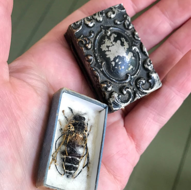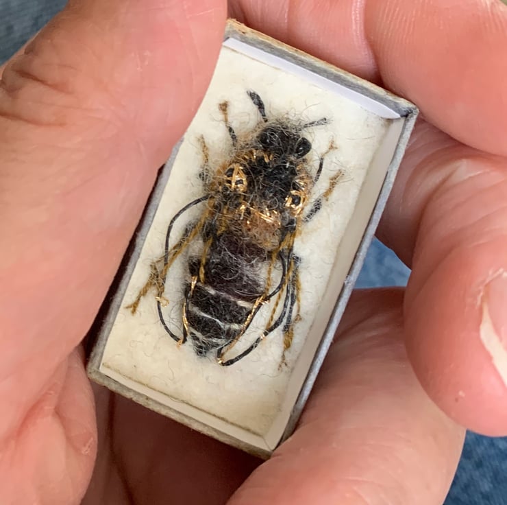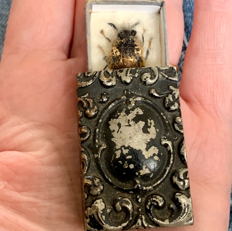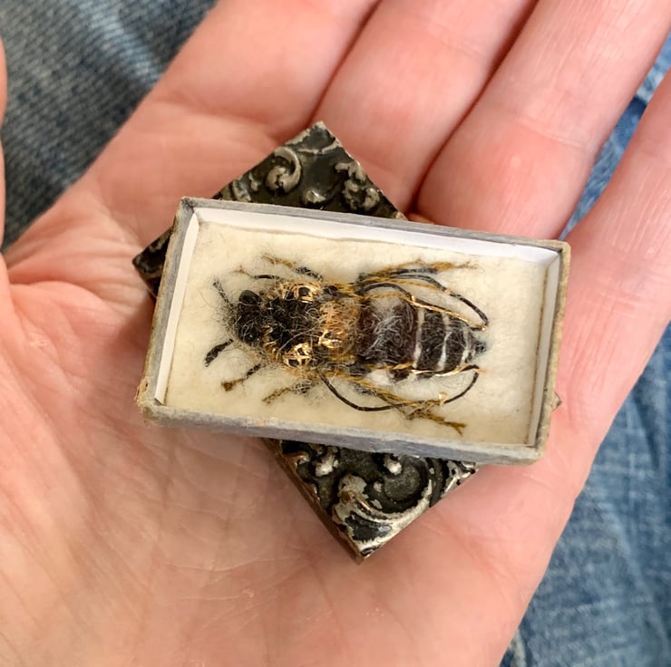 This is Bee 71 Rufescent Sharp-tail Bee or Coelioxys rufescens and I adore this beautiful matchbox holder, isn’t it divine? It is approximately 2” long and the wood and paper matchbox slips inside the decorative metal antique holder. The bee has lots of gold thread which makes it very decorative. The bee is made of wool, vintage thread and kamibari gold and silk embroidery thread.