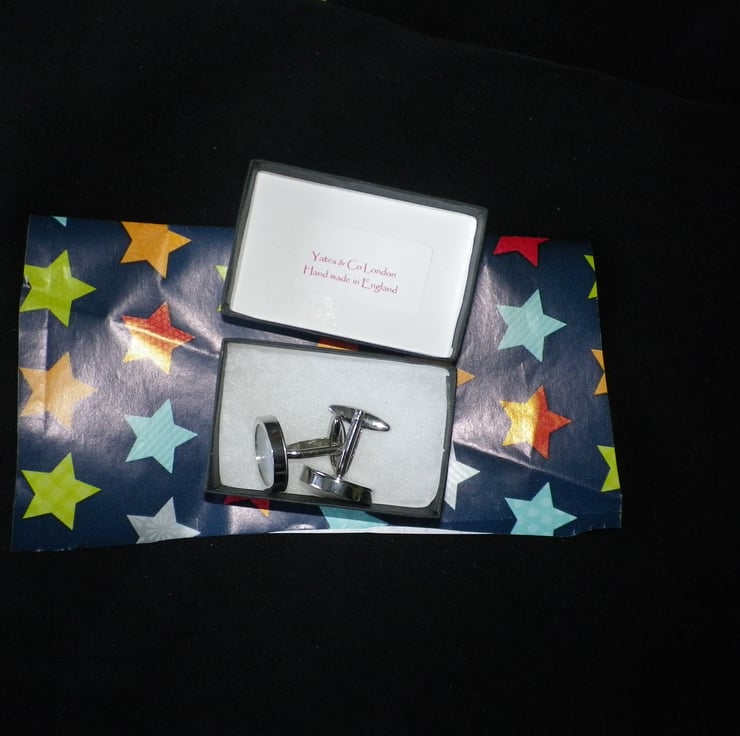 They are all protected with a domed glass cabochon, and you will receive your purchase in attractive black presentation boxes.....gift wrapped