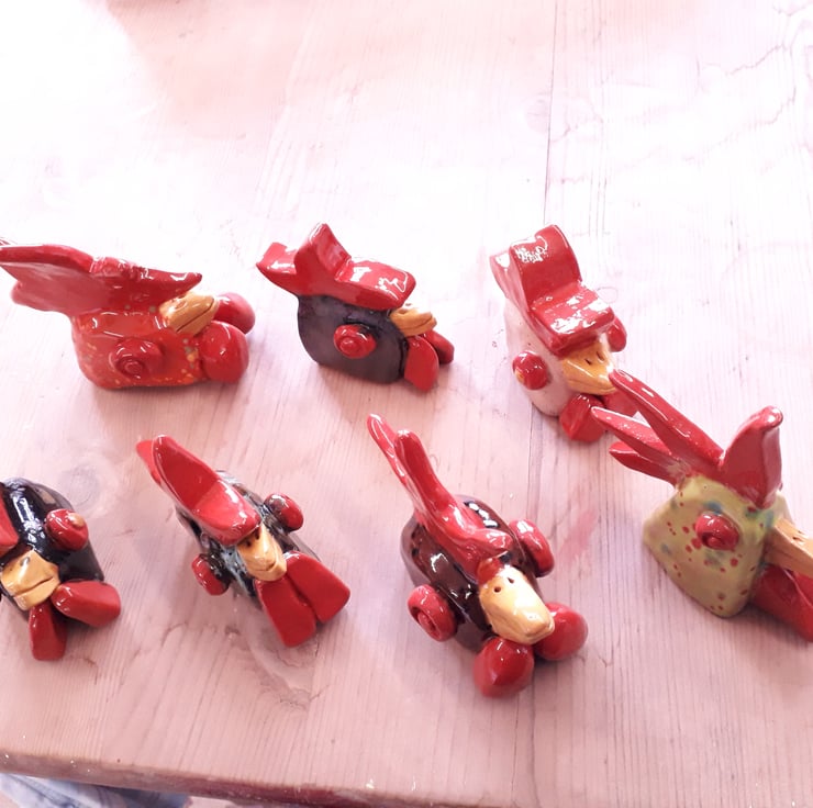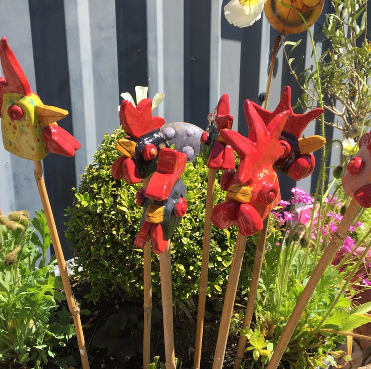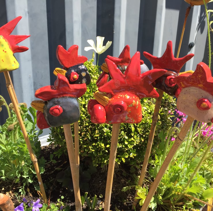 Cane Tops for your garden. Made from red earthenware clay, all glazed to suit the subject! Last for years and years in all weathers in your garden. Introducing the Chicken Family 7 individuals each one unique and full of character. I use a variety of different bamboo canes to give a variety of hole sizes to fit bamboo canes.