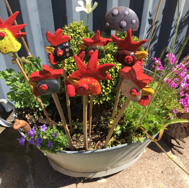 In 2003, as a keen gardener I wanted some cane tops, but they were all very boring and plastic. Working in my pottery one day messing around with a bit of left-over clay, I started making a toadstool, my husband came in and asked what I was making, and I said not sure! He came back with a bamboo cane and said "Cane Tops" - boom excellent idea. I have sold them at various garden shows in the UK.