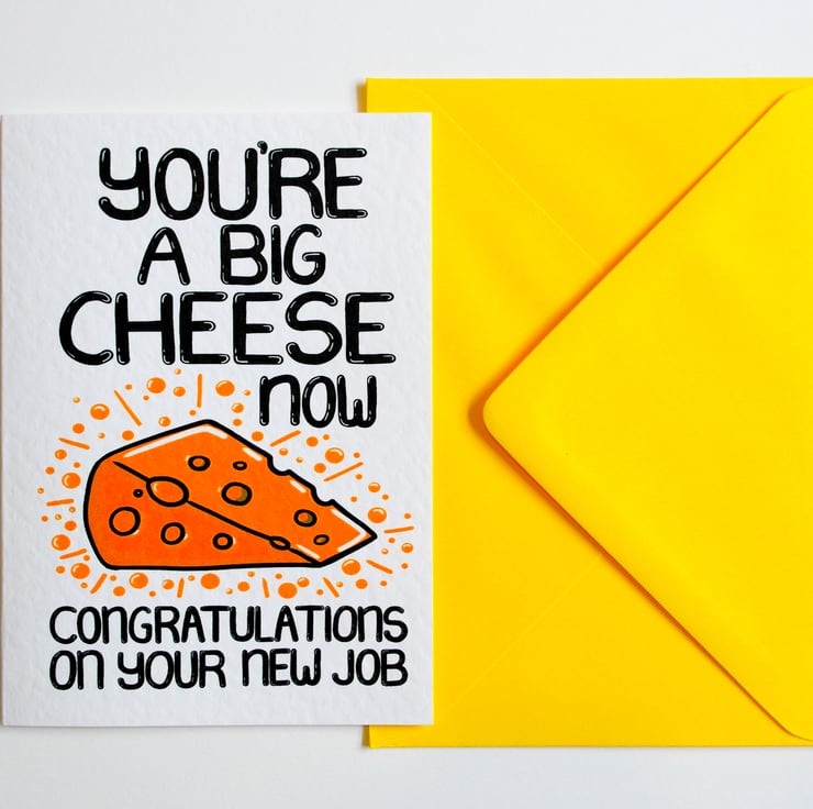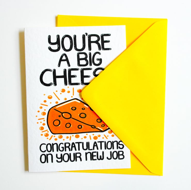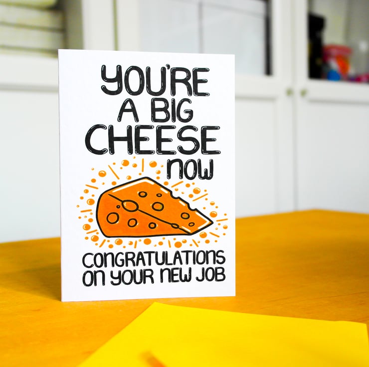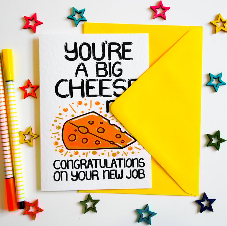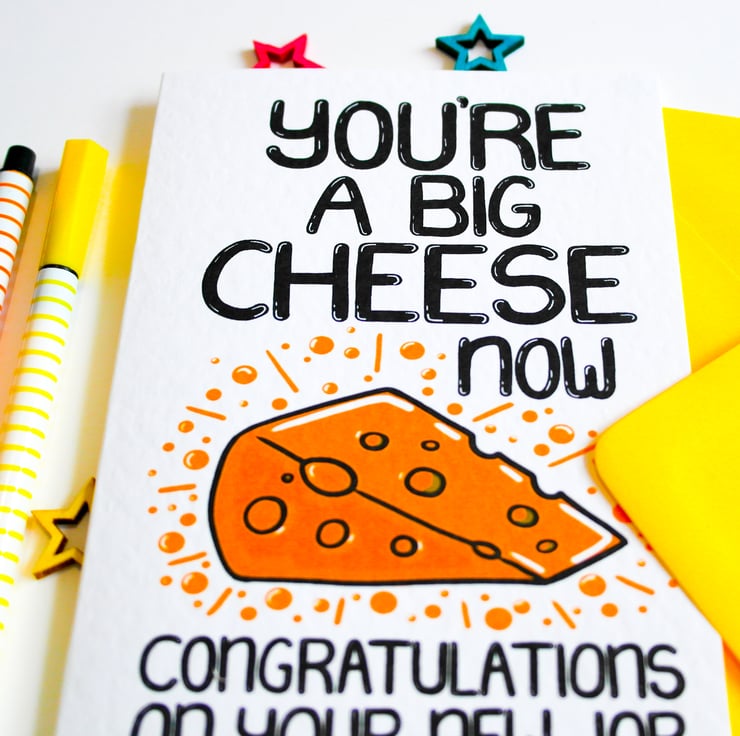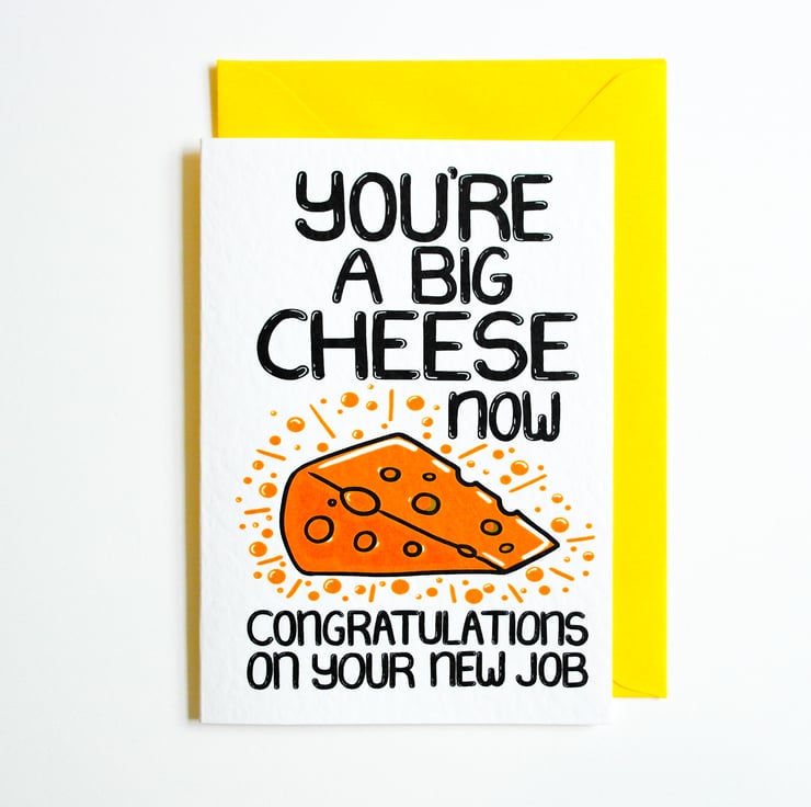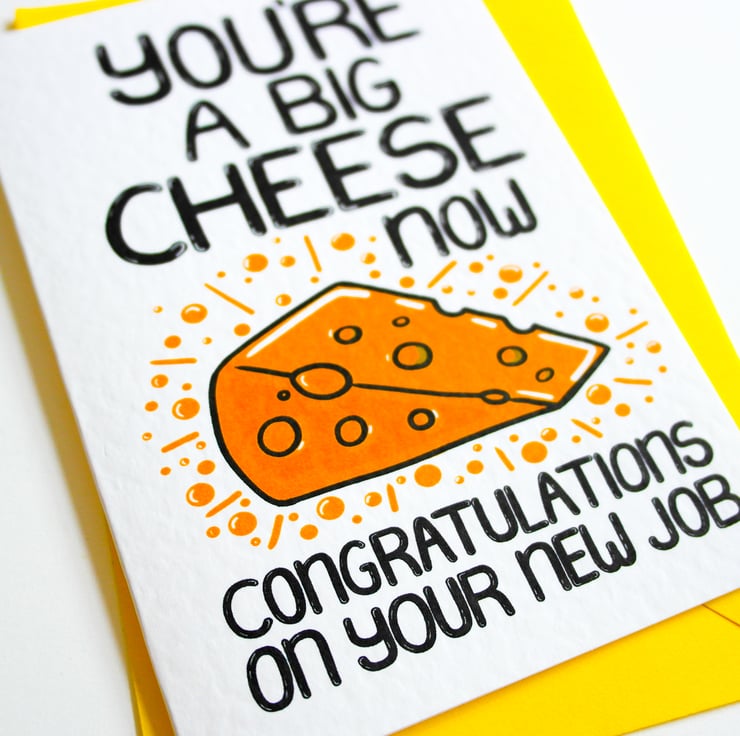 Greeting on front: YOU'RE A BIG CHEESE NOW CONGRATULATIONS ON YOUR NEW JOB