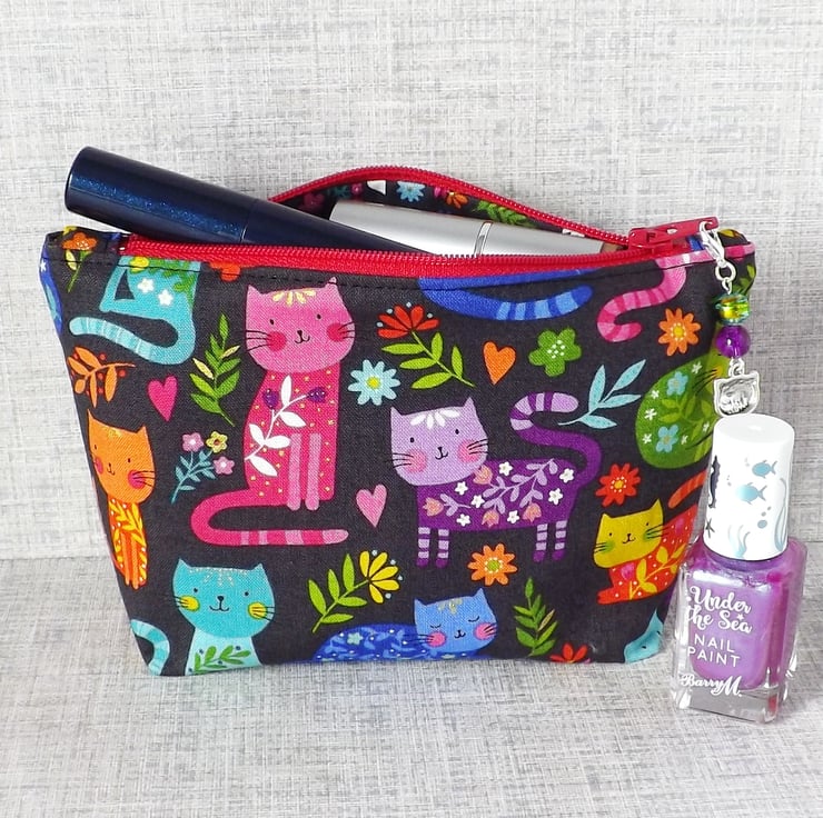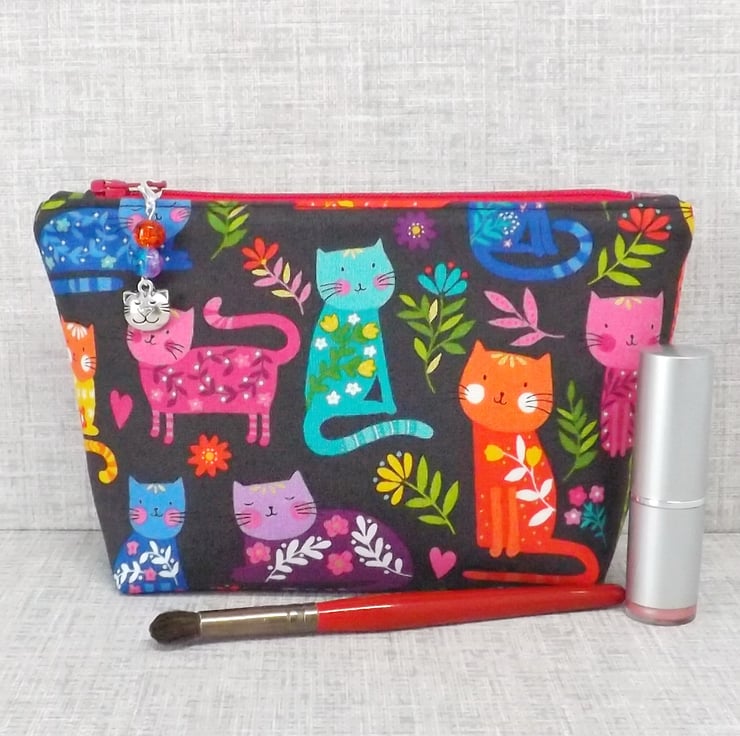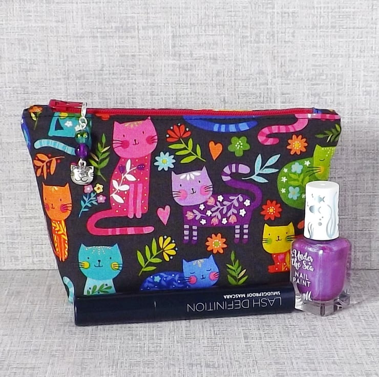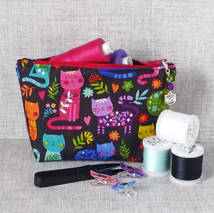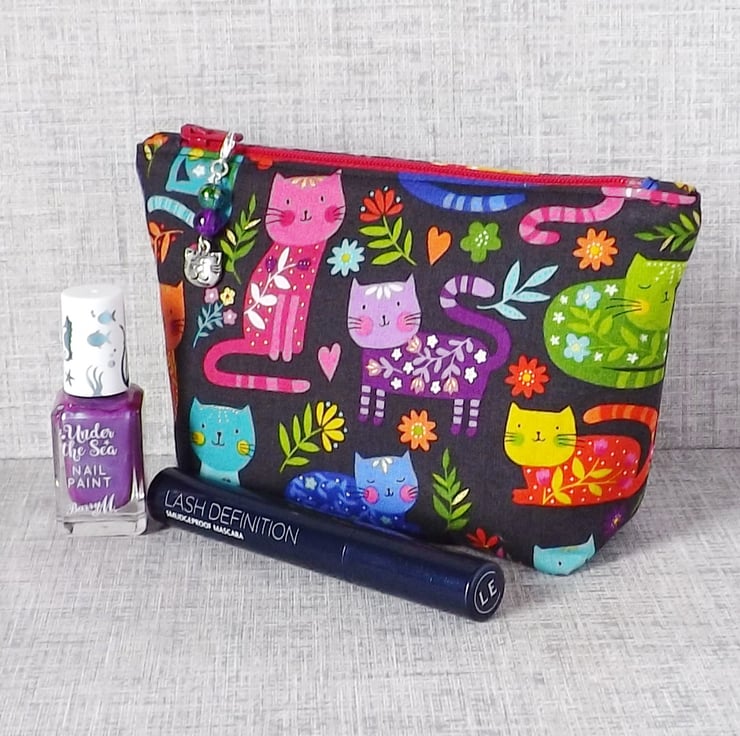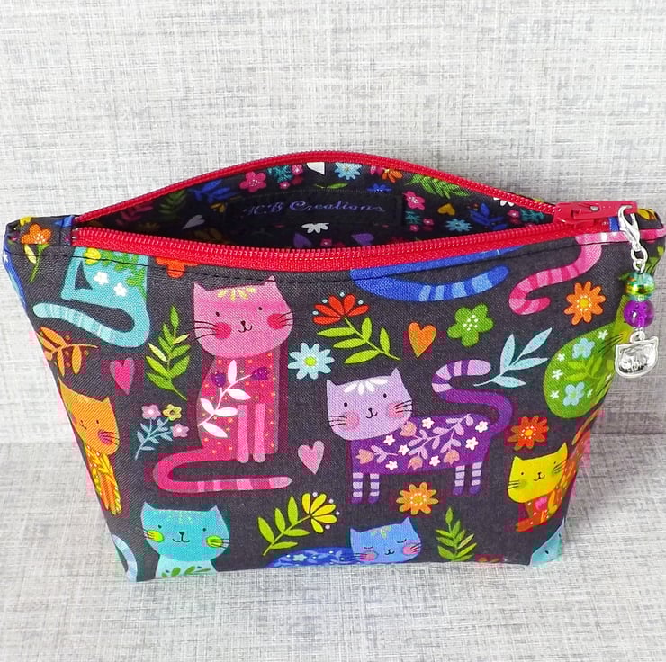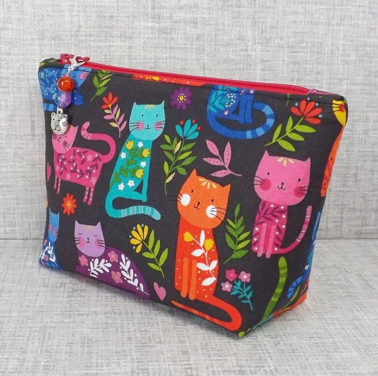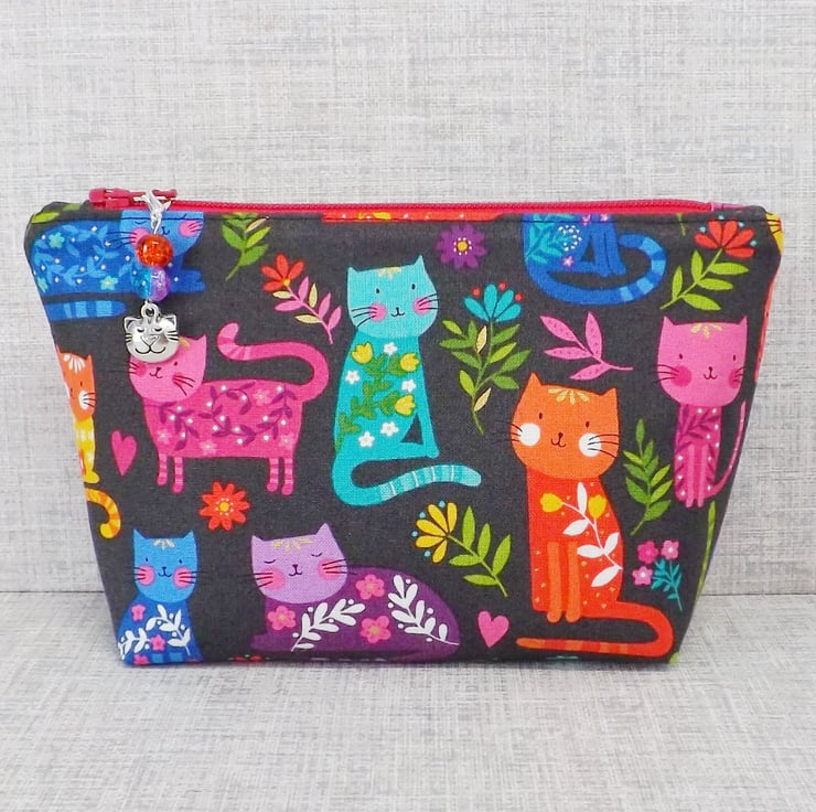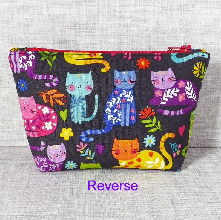 The main fabric has a vibrant cat design in shades of pink, purple, green and blue, on a dark grey background. The lining is a co-ordinating cotton fabric with a small multicoloured floral design on a dark grey background.