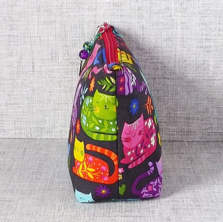 The main fabric has been backed with fusible interfacing to give body to the bag, and there is a zip closure on the top with a bead & cat charm on the zipper pull.