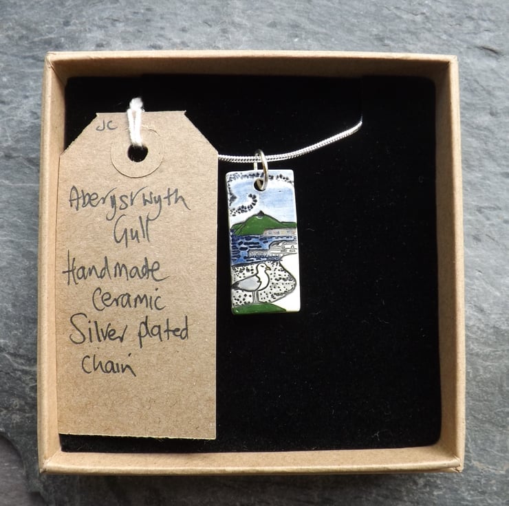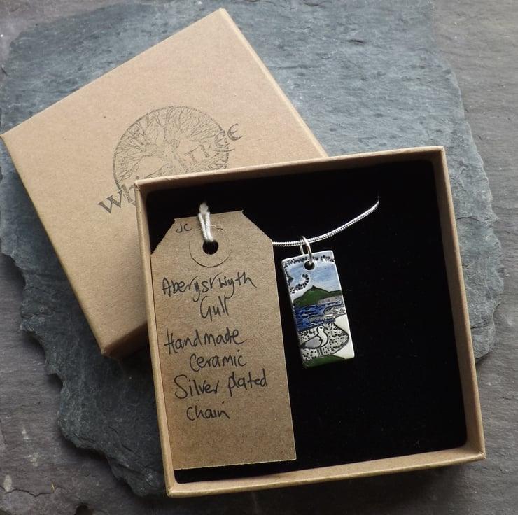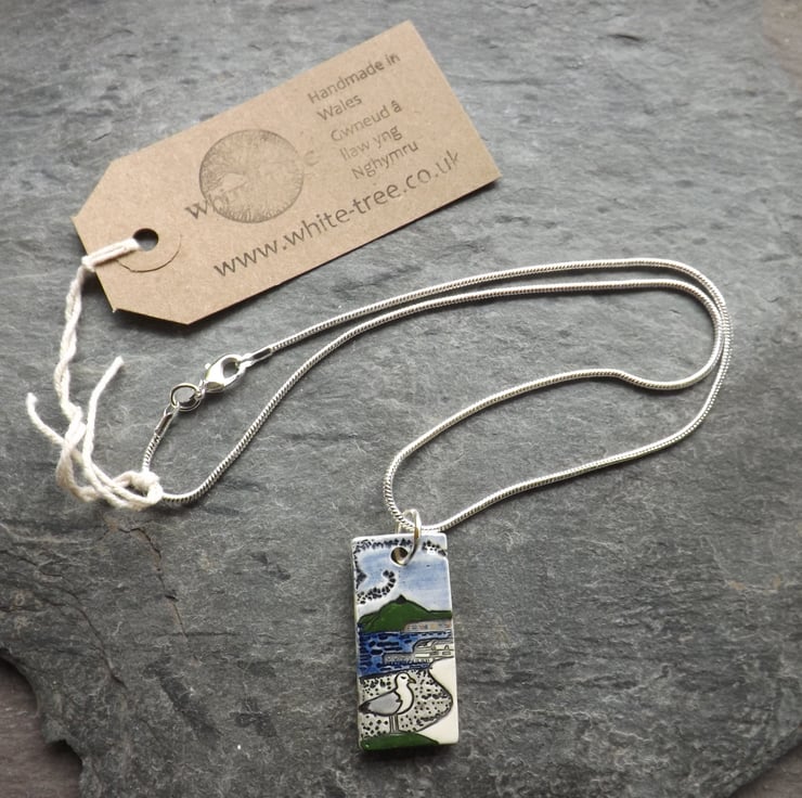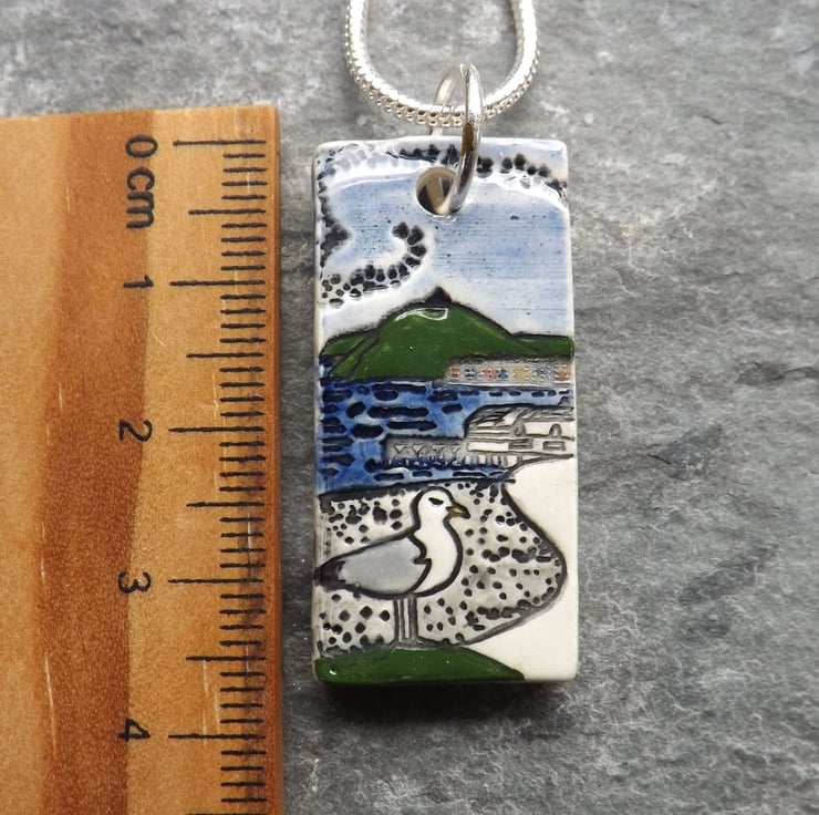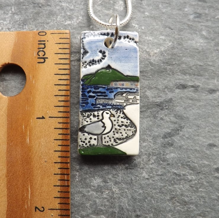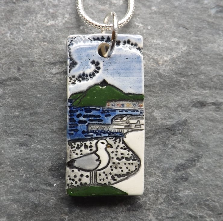 A seagull stands proudly in the foreground of this little coastal scene. As with all my jewellery it is made and decorated completely by hand.