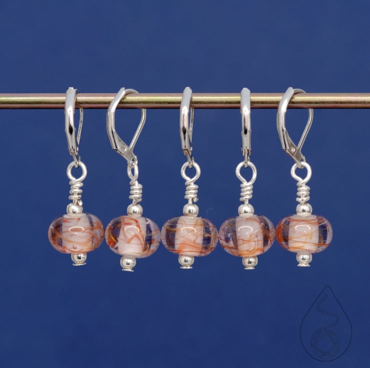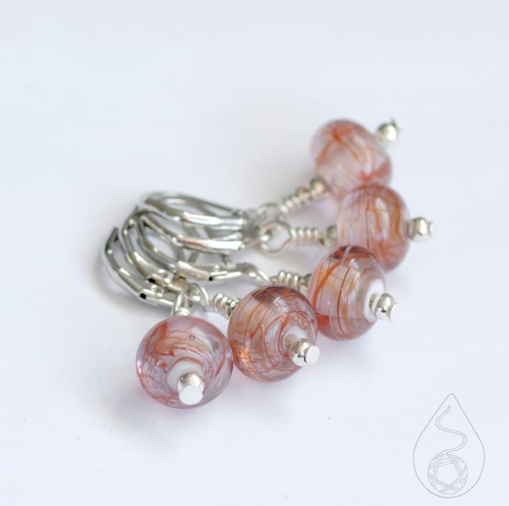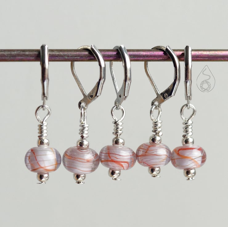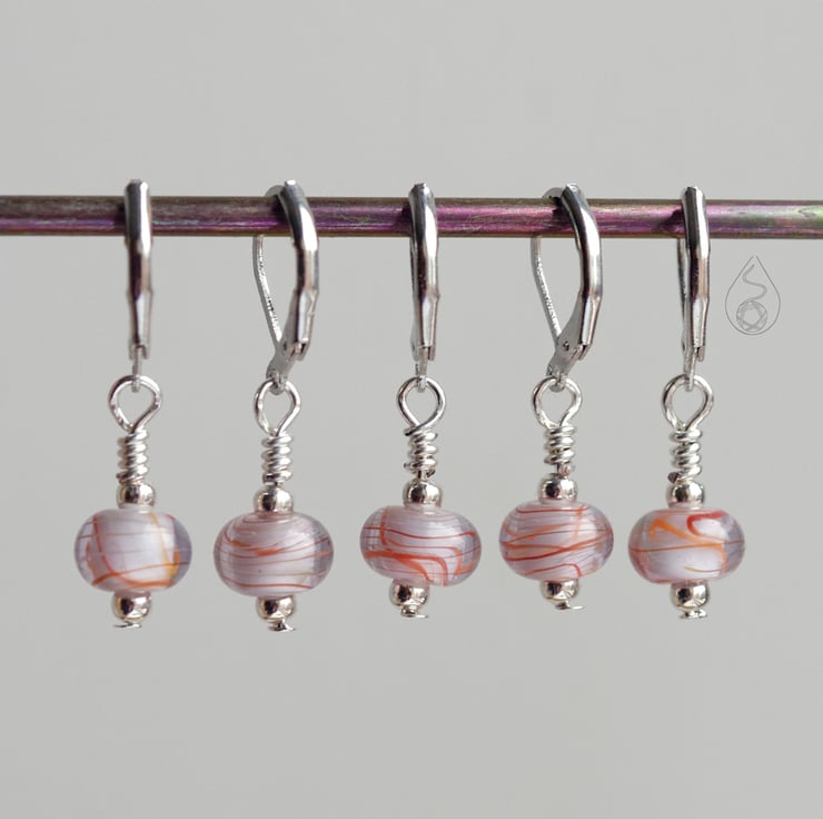 A set of 5 stitch markers made with lampwork glass beads with swirls of reds and oranges.