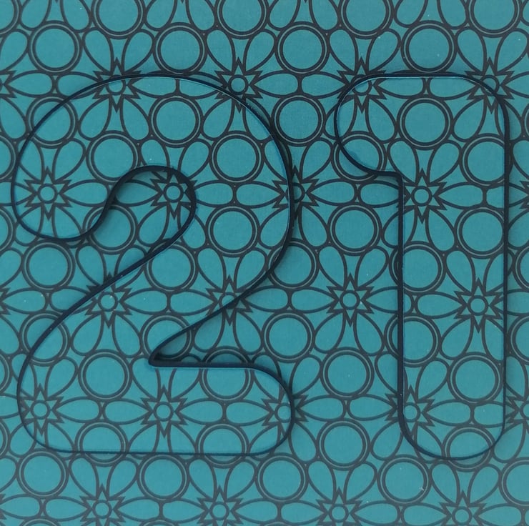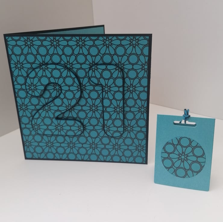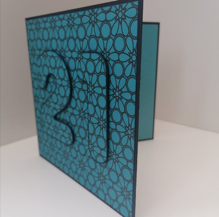 Teal and black geometric print on navy card base. 21 is pattern matched to background paper, raised and has a fine navy border.