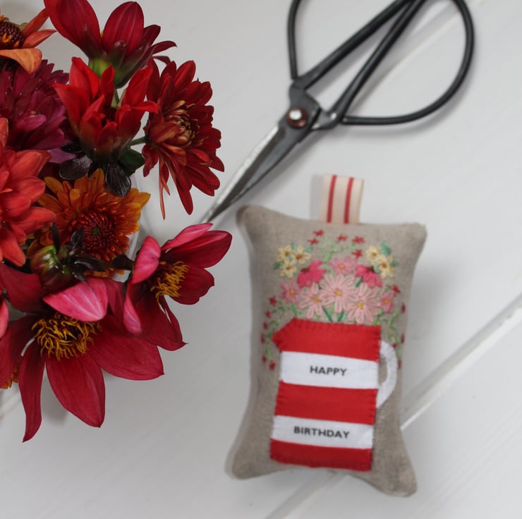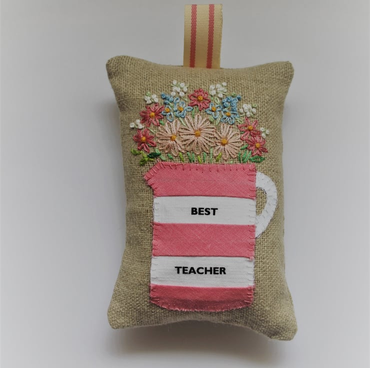 Natural linen lavender bag with a hand-appliqued stripy jug motif with the words ‘Best Teacher’. The jug has been created from hand-cut strips of fabric which have been stitched together to give a stripy effect. I have then added hand-embroidered flowers to the design using embroidery silks and the finishing touch is a co-ordinating vintage style striped ribbon. The bag is filled with new polyester wadding and a goodly handful of English lavender picked from my own garden in Norfolk.