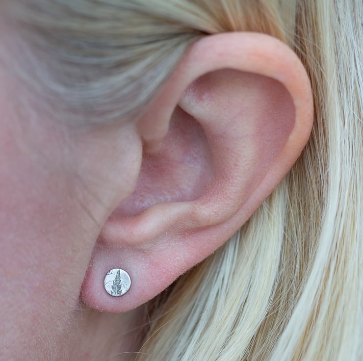 The stud earrings have been given an oxidised finish, to enhance the pattern. They've been given a coating of Renaissance Wax to protect the finish.