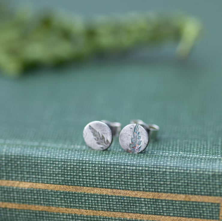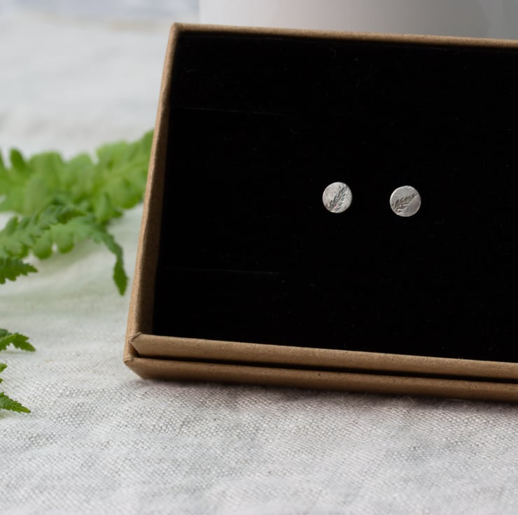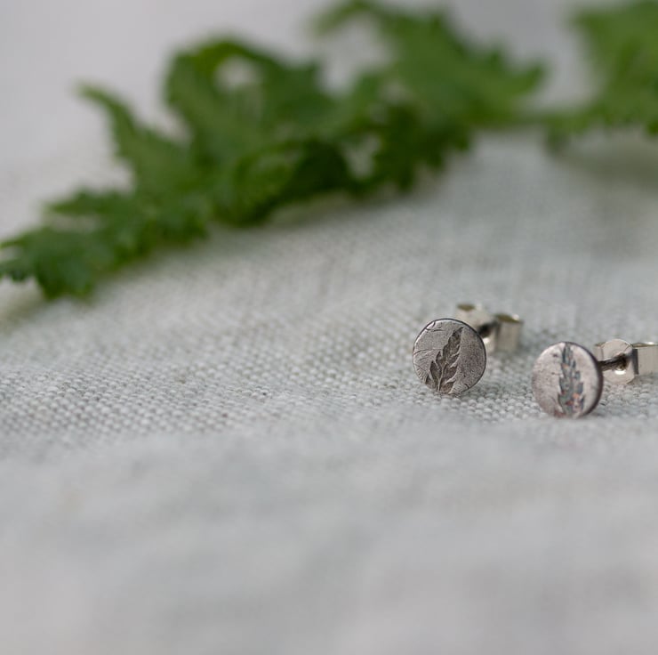 These cute mini studs are handmade from recycled fine silver clay. The clay is imprinted with a real fern leaf, kiln fired,then polished.
