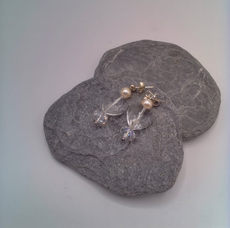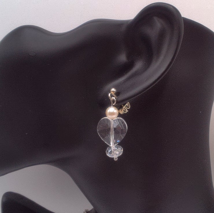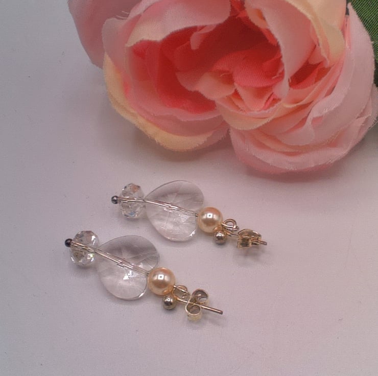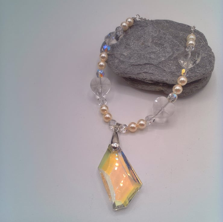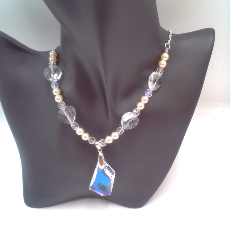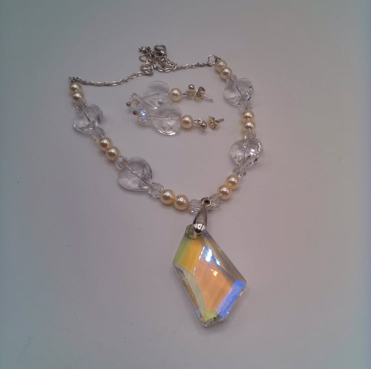 This stunning shimmering crystal heart and pearl necklace with a lovely faceted pendant and matching earrings is made using silver plated chain with a centre section made using 6 mm cream pearls and clear glass crystal beads and 15 mm x 12 mm glass crystal heart beads with a centre beautiful shimmering clear crystal pendant measuring 22 mm x 18 mm which sparkles as the light catches it. It is fastened with a silver plated lobster clasp. The earrings are made using the 15 mm x 12 mm crystal heart beads with a 6 mm cream pearl and an 8 mm x 6 mm crystal rondelle bead suspended on silver plated ear studs.The measurements overall length of the necklace 15.75 inches (40 cm) with the chain section being 8 inches (20.25 cm) and the beaded section is 7.5 inches (19 cm), with a drop of 2 inches (5 cm) for the central crystal cosmic pendant. The earrings have a drop of 1 inch (2.5 cm) from the ear stud. The set would be lovely to wear with an outfit for a special occasion or a gift for a jewellery loving lady. It will be dispatched wrapped in tissue paper in an organza bag and be delivered to you via Royal Mail first class post.