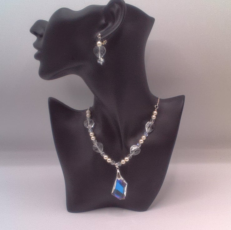 Crystal Pendant on a Pearl and Crystal Necklace and Earrings, Gift for Her