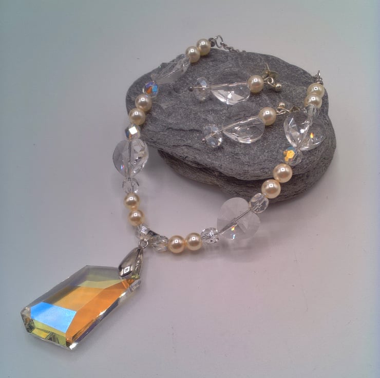 Crystal Pendant on a Pearl and Crystal Necklace and Earrings, Gift for Her