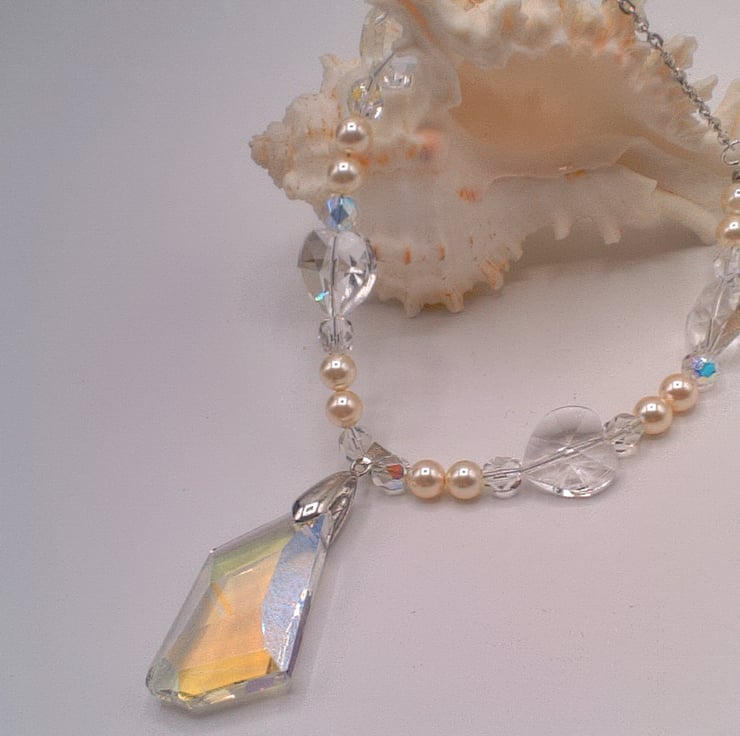 This stunning shimmering crystal heart and pearl necklace with a lovely faceted pendant and matching earrings is made using silver plated chain with a centre section made using 6 mm cream pearls and clear glass crystal beads and 15 mm x 12 mm glass crystal heart beads with a centre beautiful shimmering clear crystal pendant measuring 22 mm x 18 mm which sparkles as the light catches it. It is fastened with a silver plated lobster clasp. The earrings are made using the 15 mm x 12 mm crystal heart beads with a 6 mm cream pearl and an 8 mm x 6 mm crystal rondelle bead suspended on silver plated ear studs.The measurements overall length of the necklace 15.75 inches (40 cm) with the chain section being 8 inches (20.25 cm) and the beaded section is 7.5 inches (19 cm), with a drop of 2 inches (5 cm) for the central crystal cosmic pendant. The earrings have a drop of 1 inch (2.5 cm) from the ear stud. The set would be lovely to wear with an outfit for a special occasion or a gift for a jewellery loving lady. It will be dispatched wrapped in tissue paper in an organza bag and be delivered to you via Royal Mail first class post.