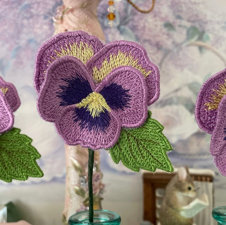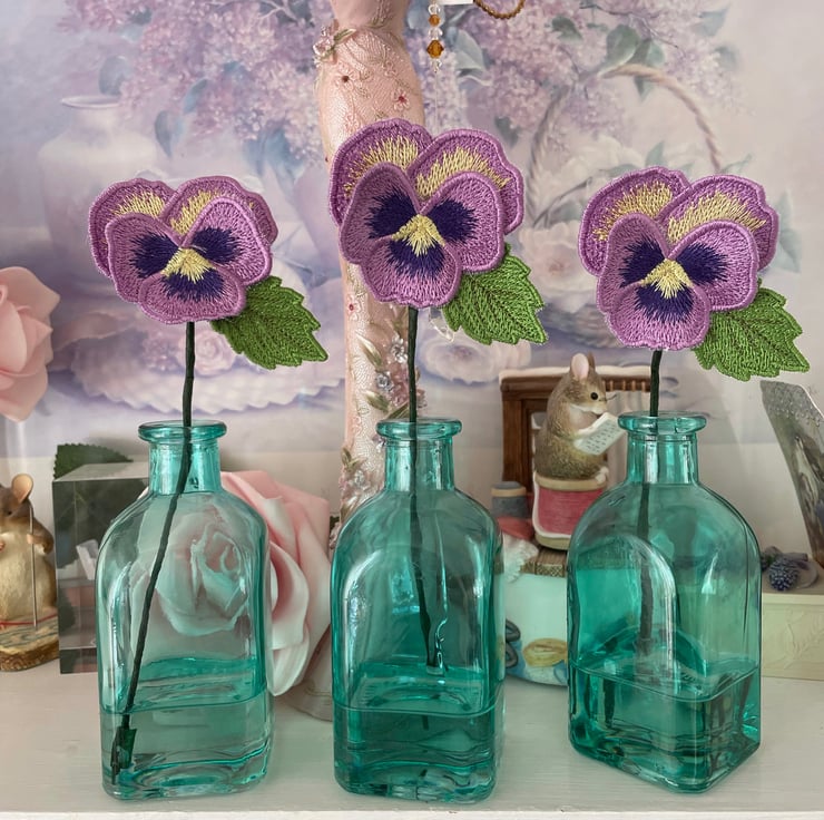 A delicate pansy and leaves embroidered on my embroidery machine onto organza. Hand cut design with a green wrapped stem. The bottom of the aqua glass bottle has been filled with crystal clear resin to give the effect of water and to keep the pansy secure.