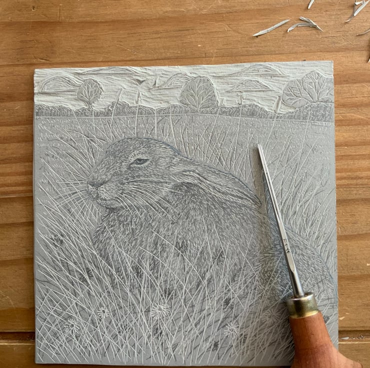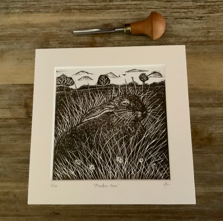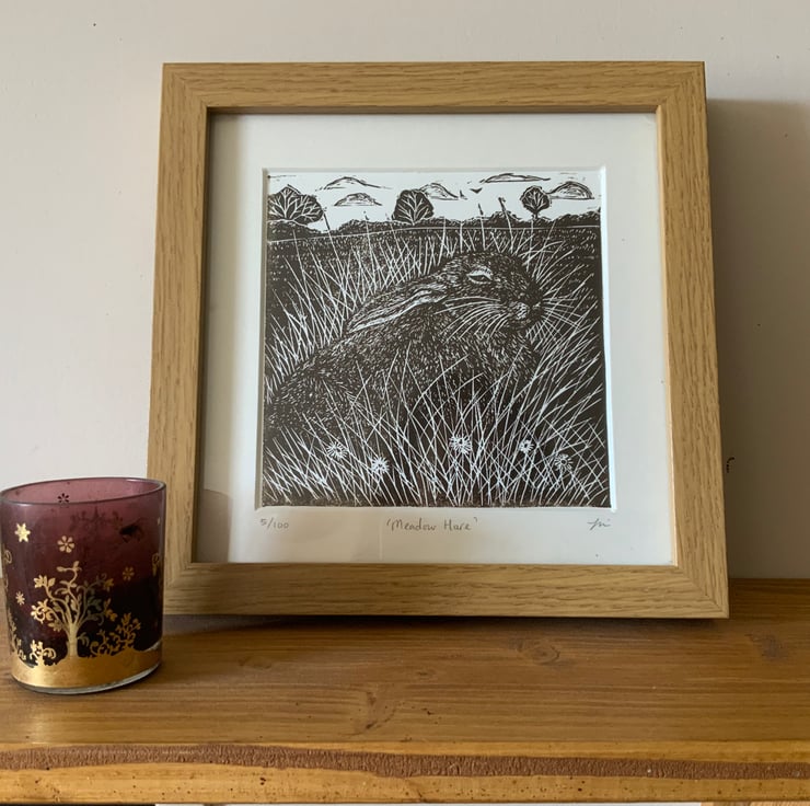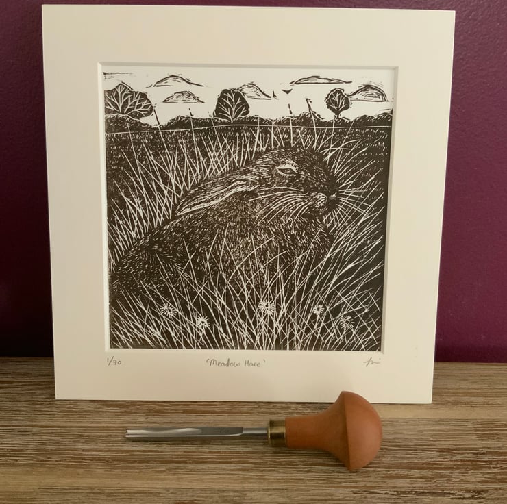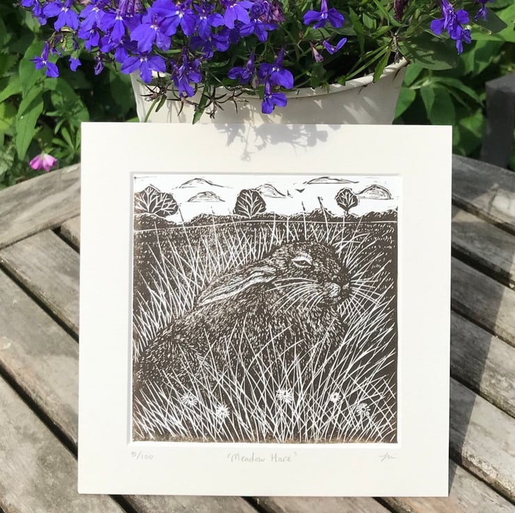 This is a limited edition original Linocut print of a Brown Hare in a summer meadow, sat in the long grass with views of fields behind.