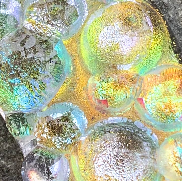 To make this pendant, I hand cut tiny little squares of dicroic glass in shades of pale green and gold to represent lichen that grows on ancient trees. I then fired the squares overnight in a kiln to make little balls of glass. Next, I arranged the pieces into a glass base and fired the whole thing overnight in my kiln. The next day, I added the snake chain.