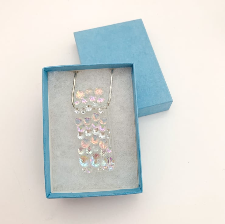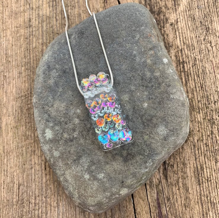 Fused glass pendant, handmade from lots of individually made dichroic glass balls. The glass pendant has a channel in which the snake chain runs, so it appears to be floating. This pendant comes on a sterling silver 18 inch snake chain.