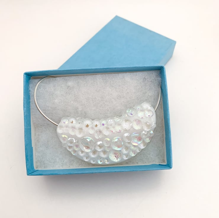 To make this pendant, I hand cut tiny little squares of dicroic glass in different shades. I then fired the squares overnight in a kiln to make little balls of glass. Next, I arranged the pieces into a opaque white glass base which I have cut into a moon shape and fired the whole thing overnight in my kiln. The next day, I added the snake chain.