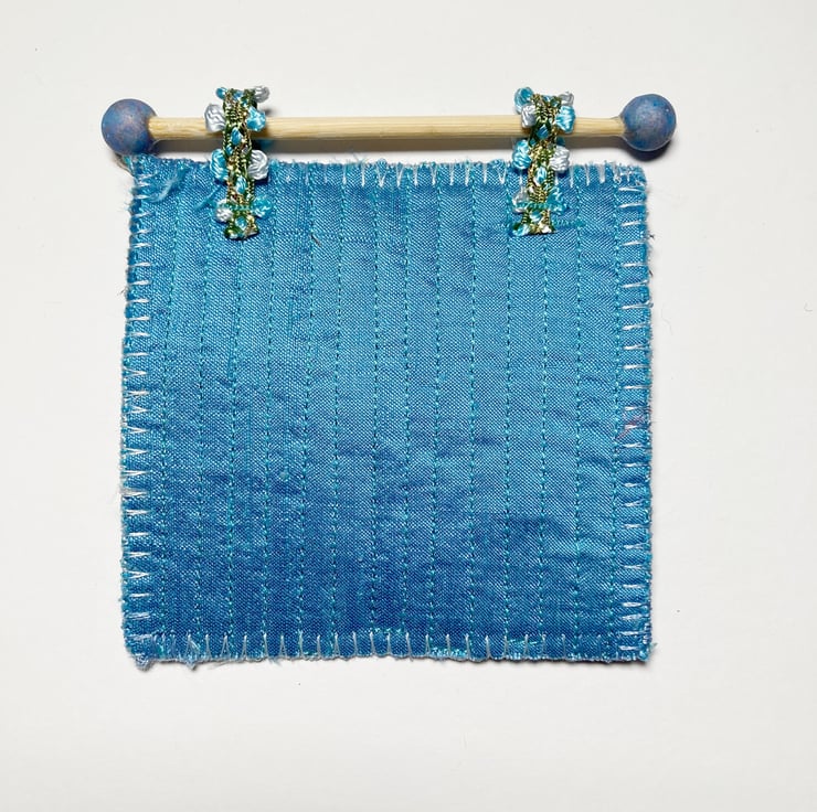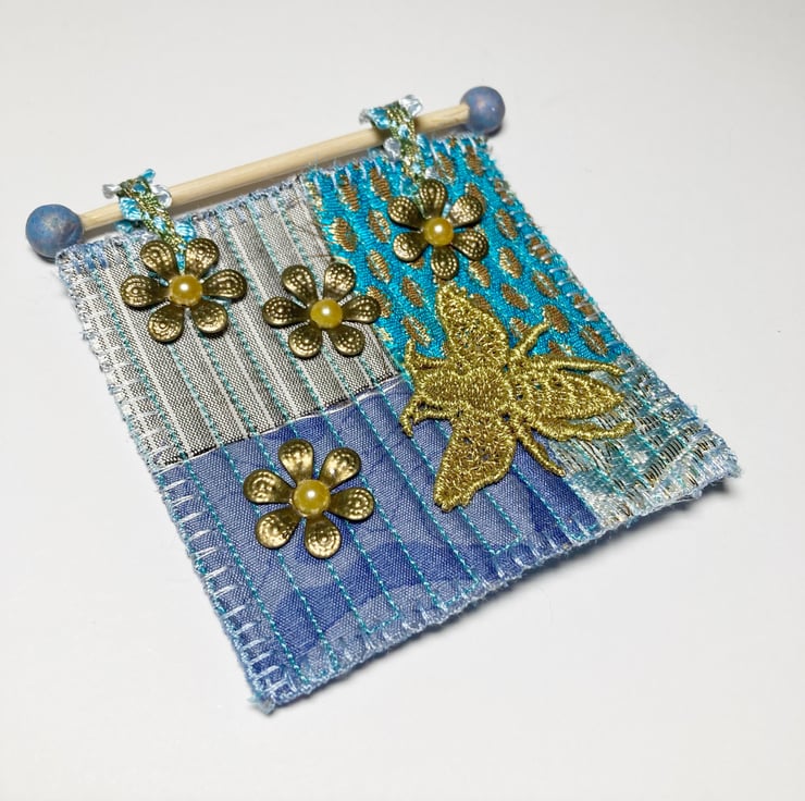 This miniature wall hanging has been made using a patchwork of various fabrics quilted onto a piece of felt. It measures approximately 3”x3” and features a beautiful bee and some flowers. After creating the quilted background, embellishments including a bee and some flowers have been added. The final artwork has then been attached to a wooden dowel by means of some ribbon loops to facilitate hanging.